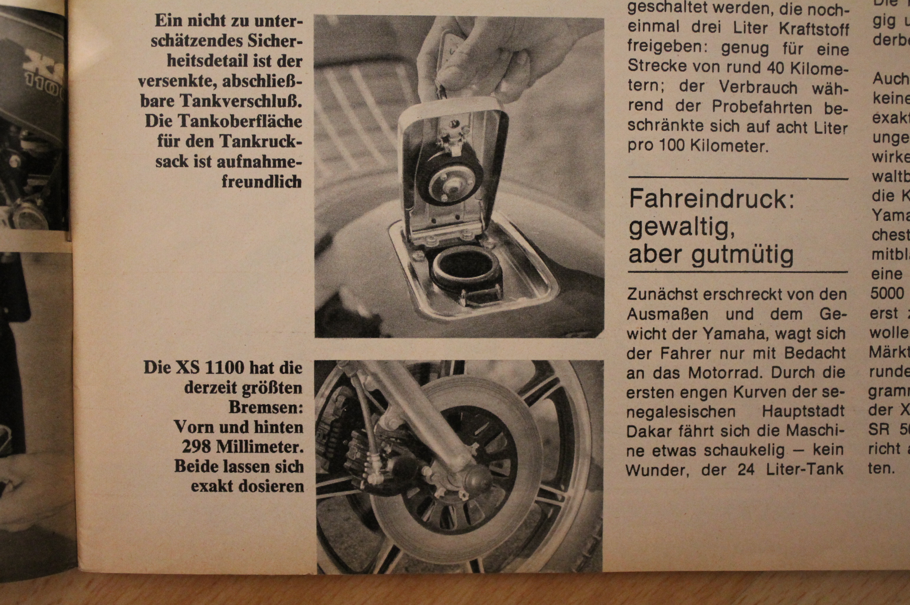 ) nach weiterer suche habe ich eine kleine Fa. gefunden die Alte Orig. Zeitschriften aus ,,vergangenen Tagen" angeboten hat! Da ich 1983 meine erste XS 1100 (2H9) als 3 Jährige, aus erster Hand in Maaron/Elfenbein (zu Deutsch: Weinrot/Cremefarben) gekauft hatte, war das Modell schon 5 Jahre auf dem Markt. Zwischenzeitlich war auch schon das Nachfolgemodell XS 1.1S (5K7, das ich in den 90er auch mal ein paar Jahre hatte) erschienen. Als diese erste XS 1978 erschien war es die schnellste, schwerste und Stärkste Serienmaschine der Welt. Im Sprint von 0-180 Km/h vergingen gerade mal 13 Sekunden, das waren Werte, die keine andere Großserienmaschine bot, auch nicht der Wahnsinns Reihen 6er aus der Honda CBX! Ja, das war Adrenalin pur! Angemerkt: wir sprechen hier von einer Zeit wo ein 4,50 Reifen Hinten das dickste war, was auf Serienfelgen passte!