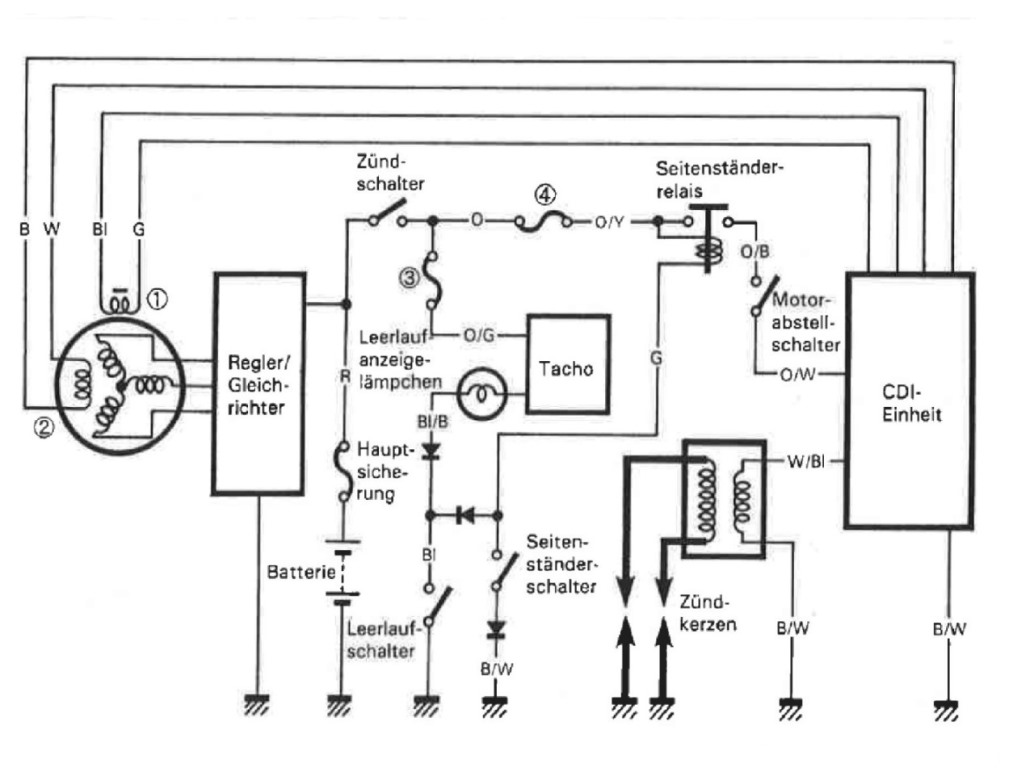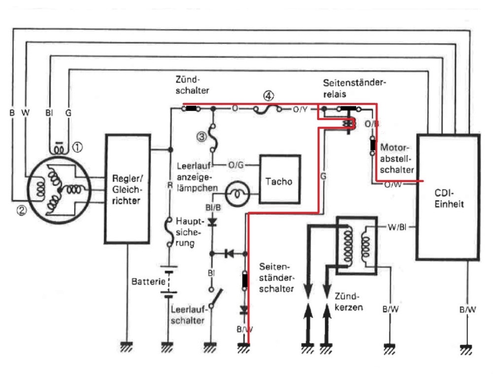 Sobald dieser Kreis unterbrochen wird, z.B. Seitenständer raus, fällt das Seitenständerrelais ab und die CDI bekommt keinen Strom. Resultat: Motor ist aus.