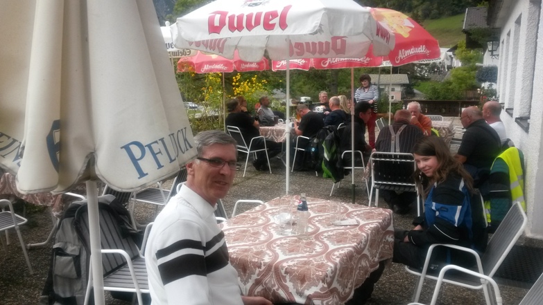 nachdem ich an suzi whongs fußrasten ein paar 10tel millimeter weggeschliffen hatte, waren wir jetzt bereit für das namlostal. auf der suche nach einer rastmöglichkeit wurden wir in namlos fündig. auf der gut besuchten terasse zeigte sich nach ein paar minuten sogar die sonne, sodaß nudelsuppe, schnitzel wiener art und der hirschbraten aus heimischen wäldern im freien verzehrt werden konnten.