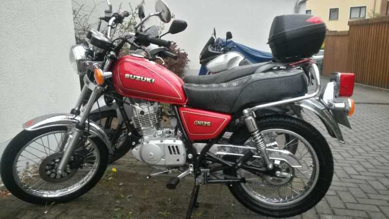 die kleine tochter meiner lebensgefährtin macht gerade A1. für ein zartes mädchen kommen nicht allzu viele maschinchen in frage, da ist niedriges gewicht und ein sicherer stand gefragt, sodaß wir uns für eine suzuki GN 125 entschieden haben. das teil ist älter als nessi (07/97), hat 4600km gelaufen und schaut aus, als käm es frisch aus dem laden. technisch alles bestens, was ich gestern auf der heimfahrt von 120km ausgiebig testen konnte. suzuki halt.