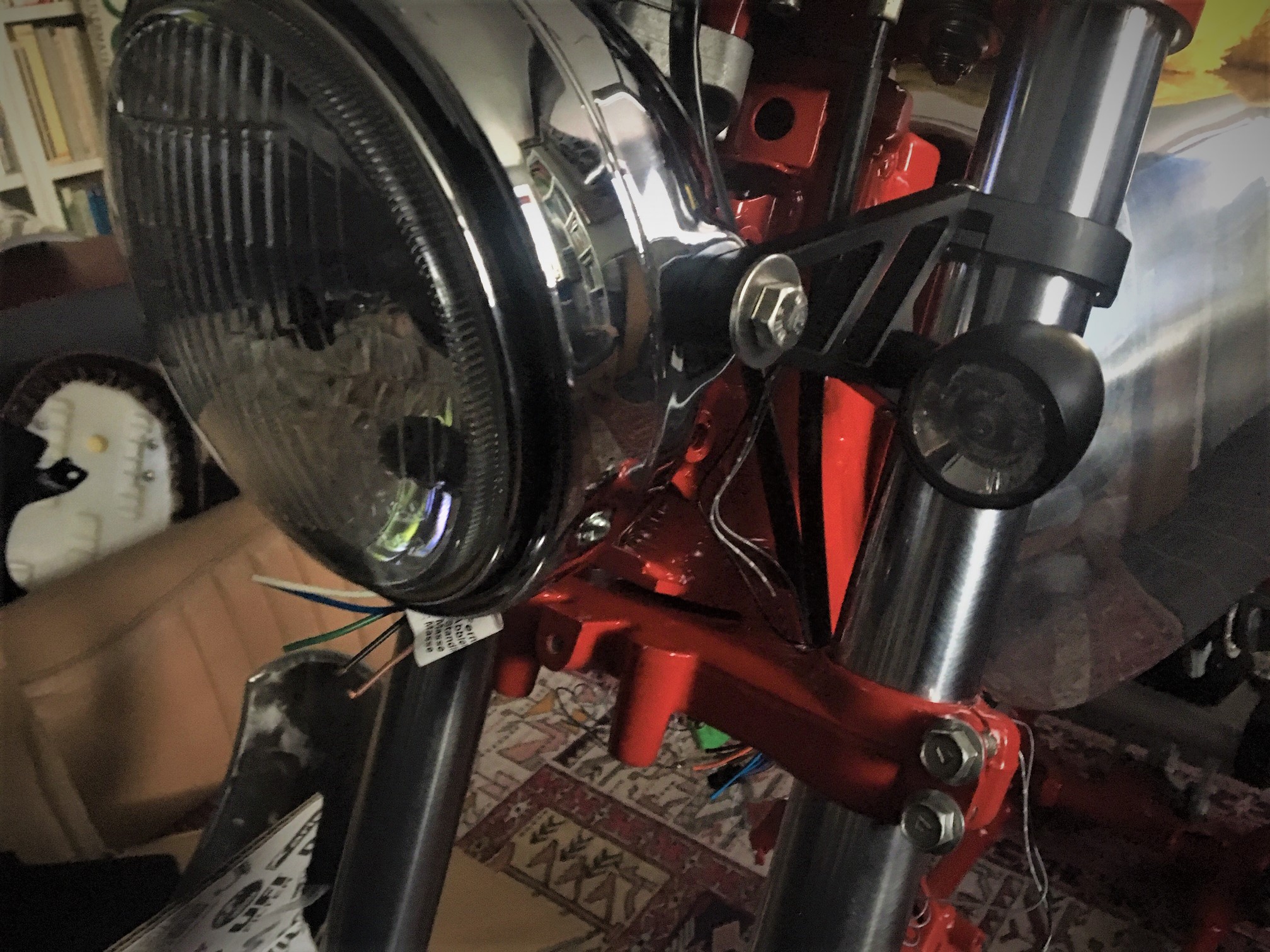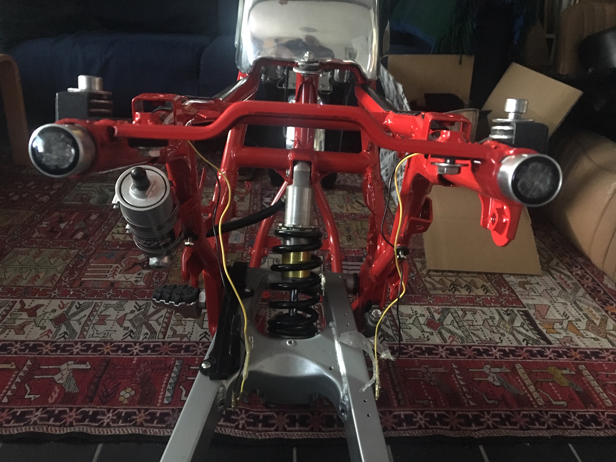 Gabelholme sind fertig, mit Wilbers Federn und auf mein Gewicht eingestellt. Armaturen sind dran, Lenker ist dran, Lampe ist dran, Gabelstabi ist dran, Kotflügelvorne ist dran, Blinker vorne und hinten sind dran.