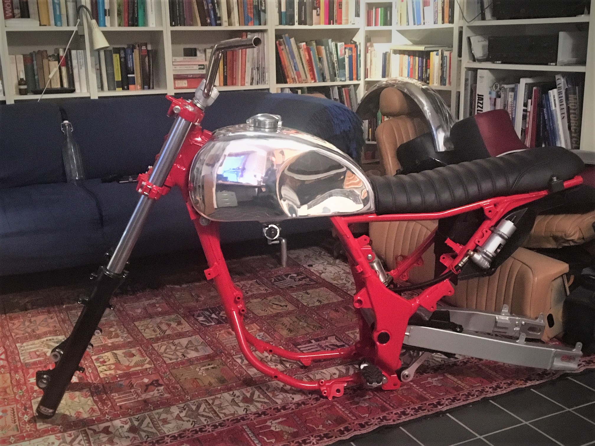 Schwinge und Sitzbankgrundplatte sind fertig. Am 9. geht sie zum Sattler.