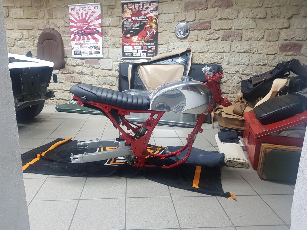 Schwinge und Sitzbankgrundplatte sind fertig. Am 9. geht sie zum Sattler.Alle Lager und Bolzen neu. Kommt mir ein bißchen hart vor, aber das ist eher gut,