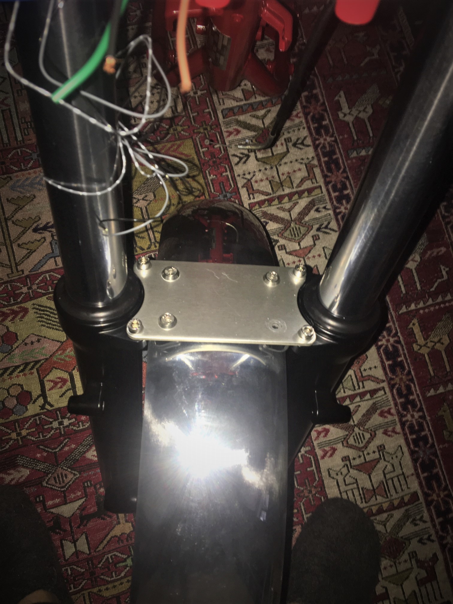 Gabelholme sind fertig, mit Wilbers Federn und auf mein Gewicht eingestellt. Armaturen sind dran, Lenker ist dran, Lampe ist dran, Gabelstabi ist dran, Kotflügelvorne ist dran, Blinker vorne und hinten sind dran.