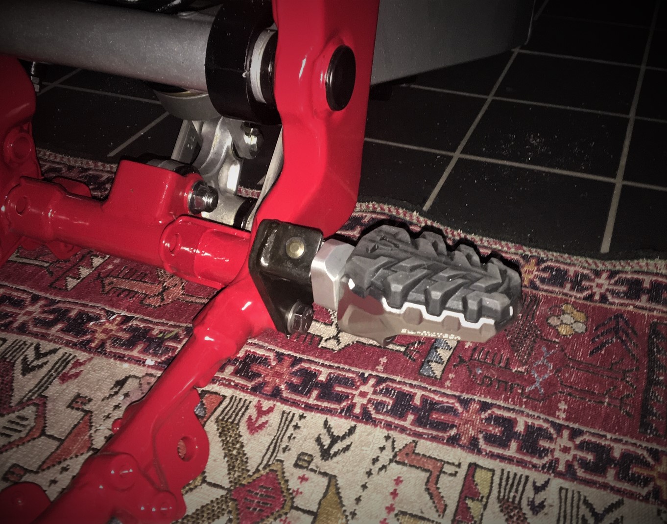 Danke. Findet ja auch im Wohnzimmer statt, da bleibt mir nix anderes übrig als sauber zu arbeiten, wenn ich nicht rausfliegen will. Mein Problem mit den Fußrasten (Originale zu weich für mein Gewicht) habe ich gelöst: Ein Paar verstellbare, die ich noch hatte, habe ich an die Originalaufnahmen anpassen lassen.