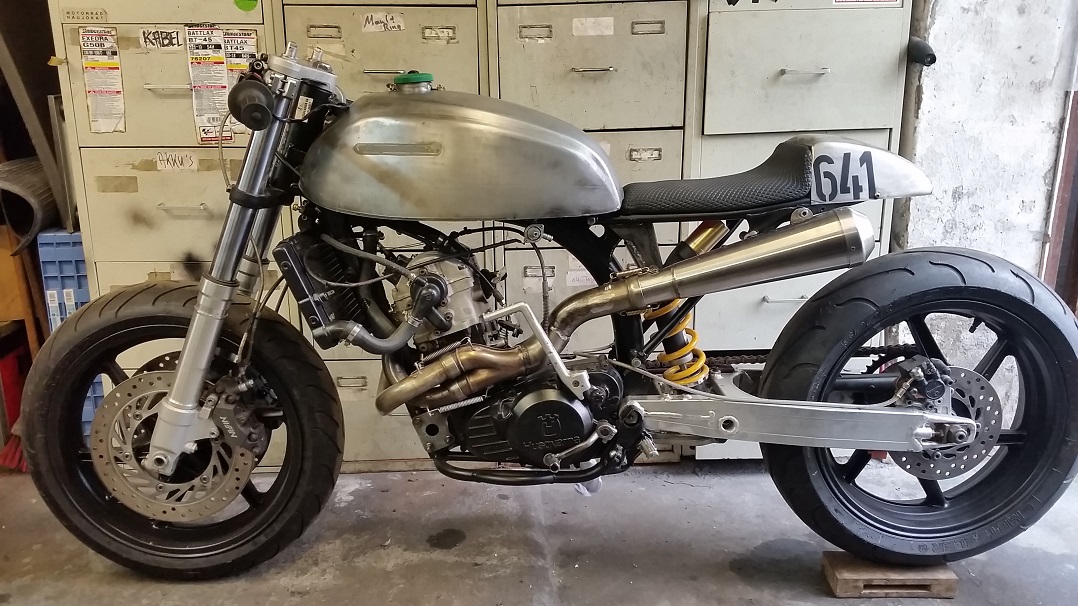 Hatte richtig Feuer, Fahrwerk war ...naja...ok, die Bremsen der Hammer. Dummerweise haben diese alten Husqvarna-Motoren nicht den besten Ruf. Dafür aber mörderische Vibrationen. Meine Finger hab ich nach 5 Runden nicht mehr gespürt. Und hatte ständig Angst das mir der Motor um die Ohren fliegt. Und das ewige Kicken ging mir auch auf den Sack. Alles Sachen die ich auf der Rennstrecke nicht gebrauchen kann. Also weg damit.