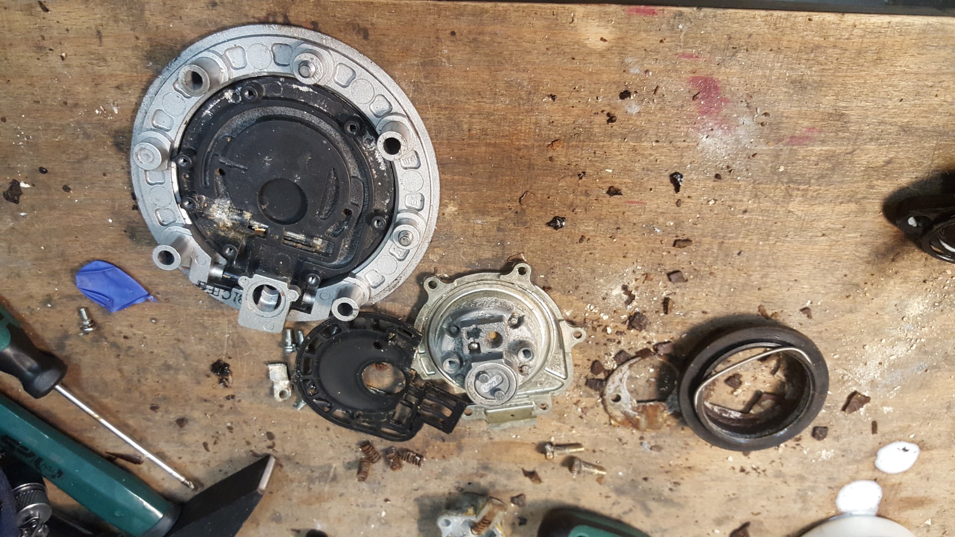 Da der Tankdeckel sowie sämtliche Mechanik darin hinüber sind hatte ich auch nix zu verlieren. Vorsicht ist auf jeden Fall geboten da dort gefühlt 20 mini Federn drinstecken. Wenn man jedoch behutsam vorgeht sollte das ziemlich fix zu machen sein.