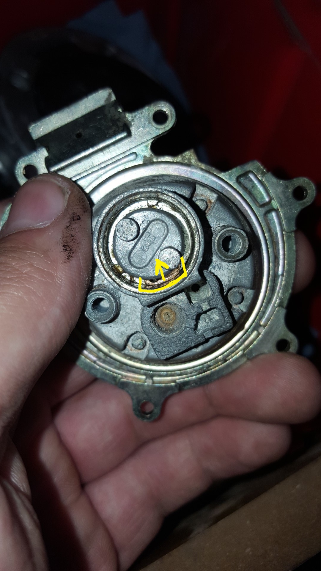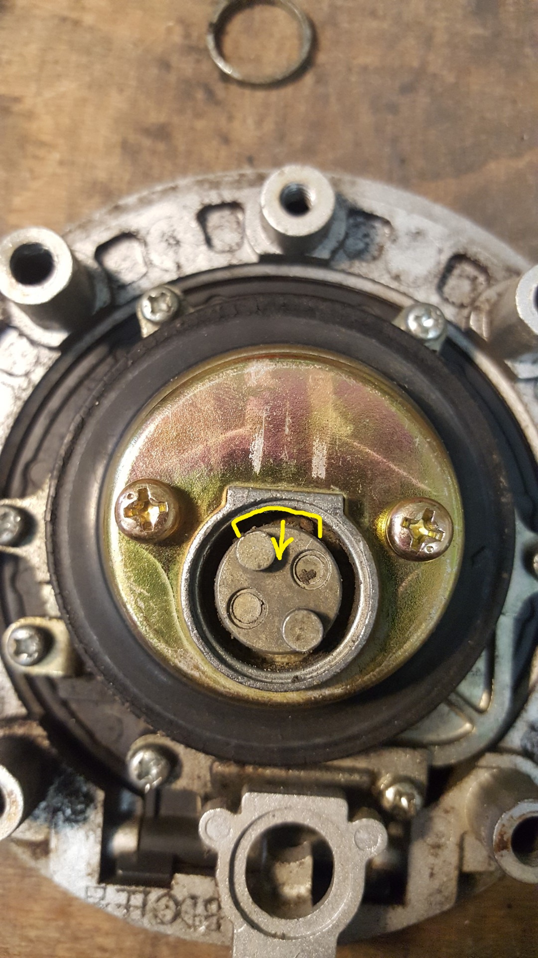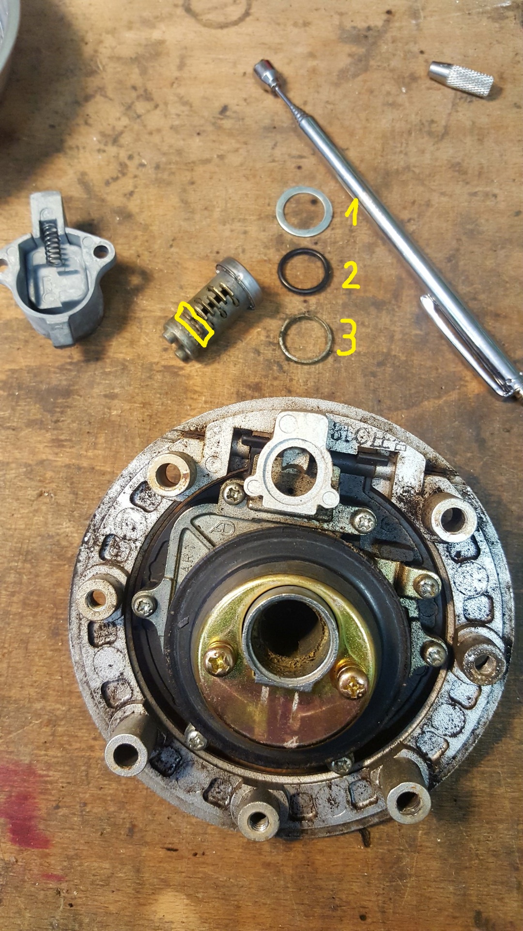 So sieht der ausgebaute Zylinder aus. Eingekreist ist hier das Plättchen welches ich erwähnt habe.