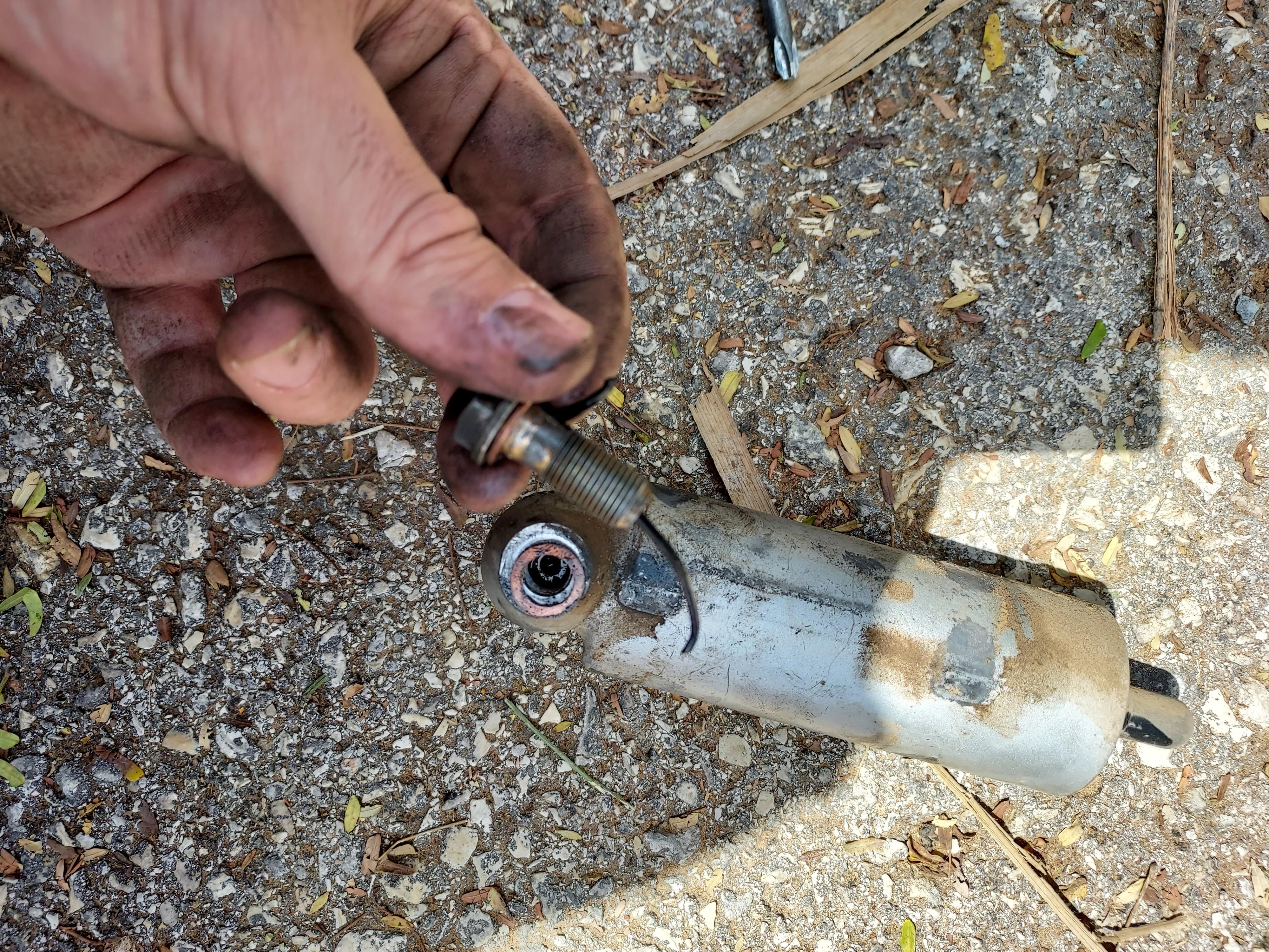 Ich habe nicht das obere Ende der Kolbenstange, also das mit dem Teil welches im Dämpfer läuft frei gemacht, sondern ich habe die untere Aufnahme vom Federbein von der Stange entfernt und alle aufgefädelten Teile entfernt. Den inneren Dämpferkopf, besteht aus vielen shims, habe ich nicht zerlegt. Ich habe ihn nur gründlich gereinigt und das neue Kolbenringband verbaut.