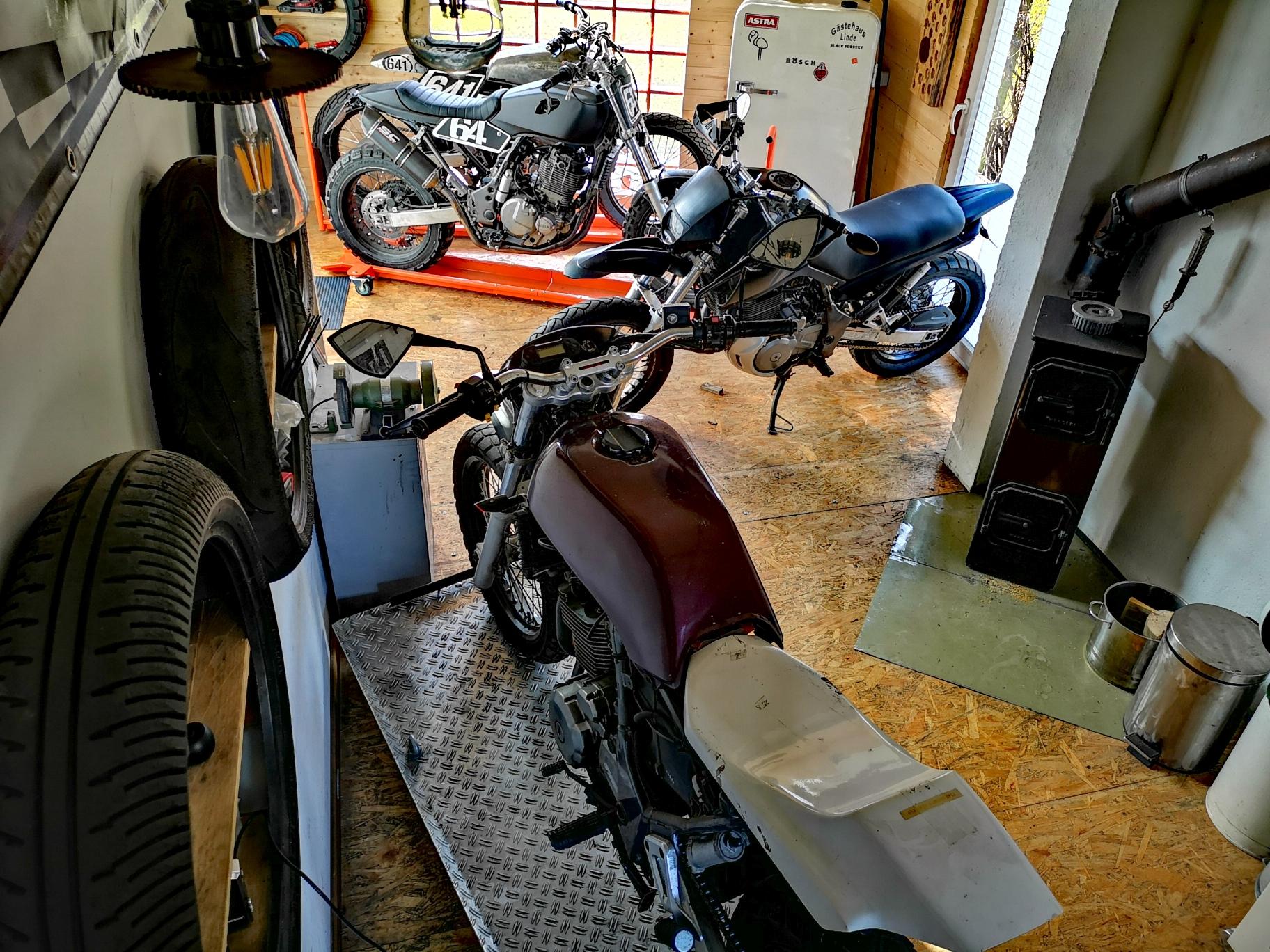 Dies ist mein Parallelprojekt zum Umbau des Racers zum Flattracker. Angefangen hats eigentlich aus Platznot. Der Ersatzteilträger meiner Racing-Freewind bestand nur noch aus Rahmen und Motor und musste aus der Garage und alleine lässt sich das schlecht wuchten. Also mussten Schwinge und Gabel rein und Räder drunter. Vorn tats ein Rad vom Racer (der steht ja grad auf 19zöllern) und für hinten gabs grad nur ne Nabe und Speichen. Was lag noch im Regal? Ah! 5.5“.... naja, Versuch macht kluch. Eingespeicht, zentriert und nen 170er drauf. Sah schon ziemlich männlich aus. Und passte so eben in die Schwinge. Großartig. Und so ließ sich die Fuhre aus der Garage und in den Bus rollen.