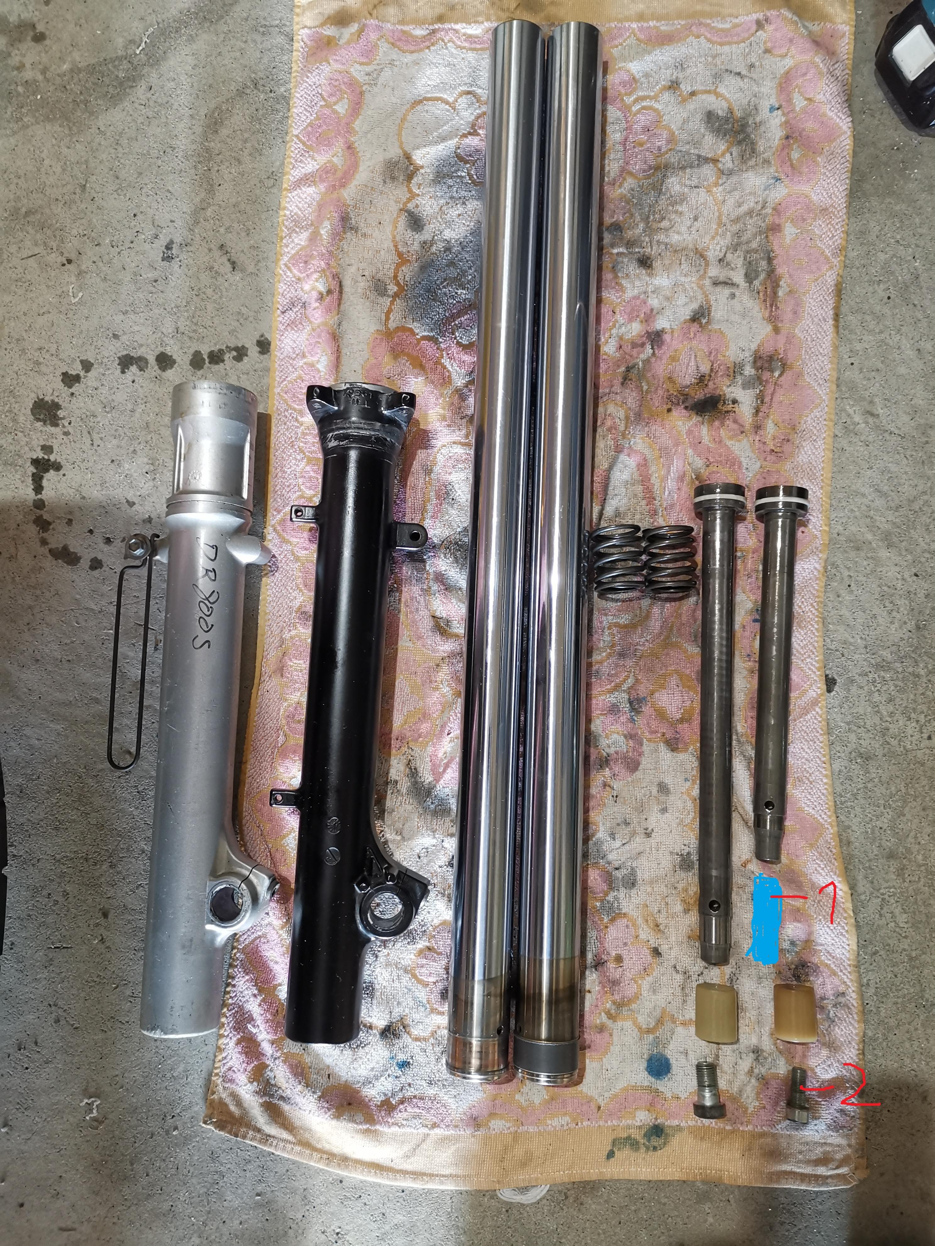 Tauchrochre, Plastikführung unten, Reboundfeder, Gleitringe, Dichtringe, Durchmesser alles das selbe, Suzuki Baukasten sei dank,