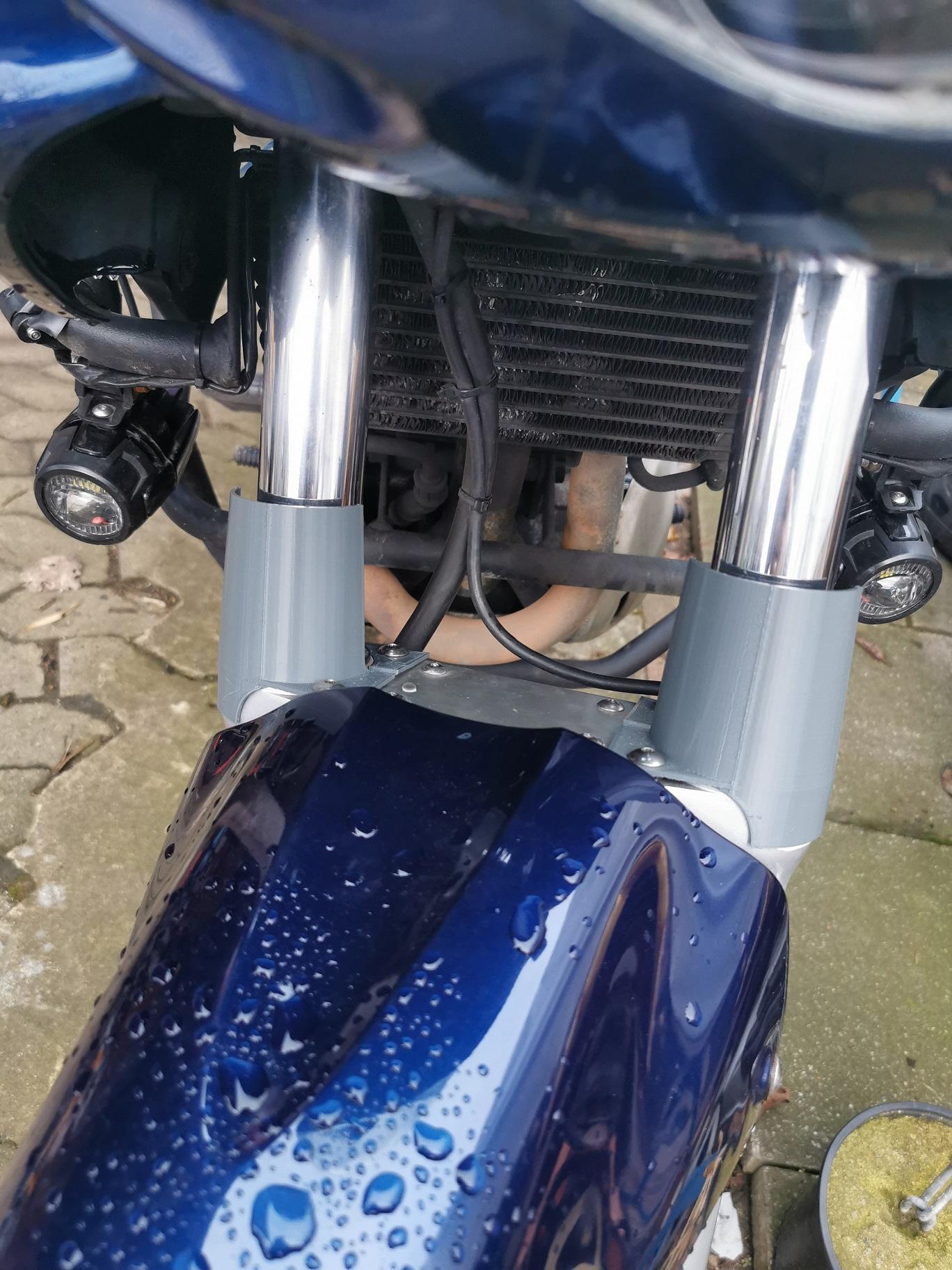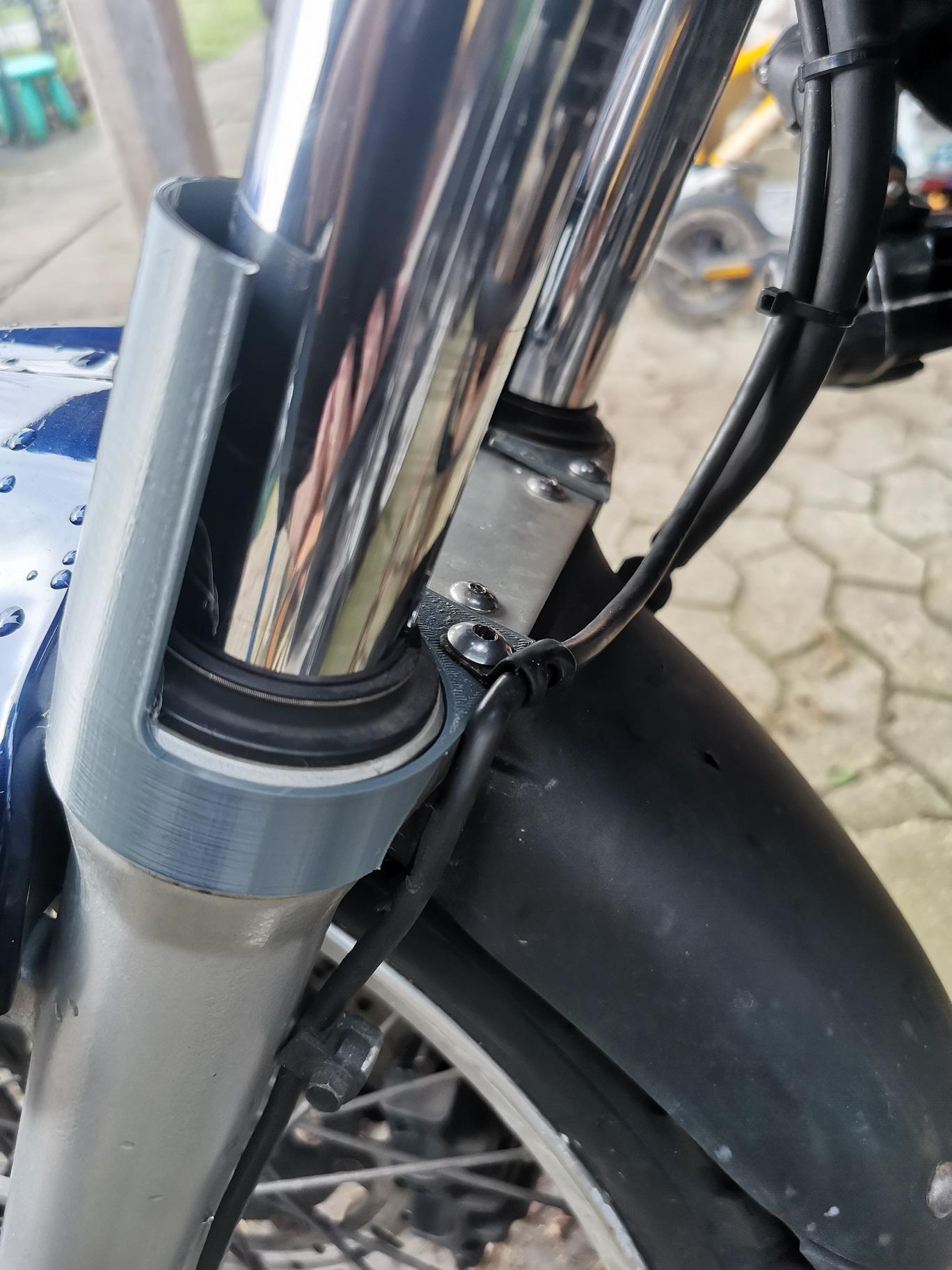 Diese werden dann, da die Gabelrohre ja eh ausgebaut werden müssen, auf die Rohre aufgeschoben, dann auch mit den Schrauben des Gabelstabi befestigt. Darauf geschoben werden kann dann der Faltenbalg und z.B. mit Kabelbinder befestigt.