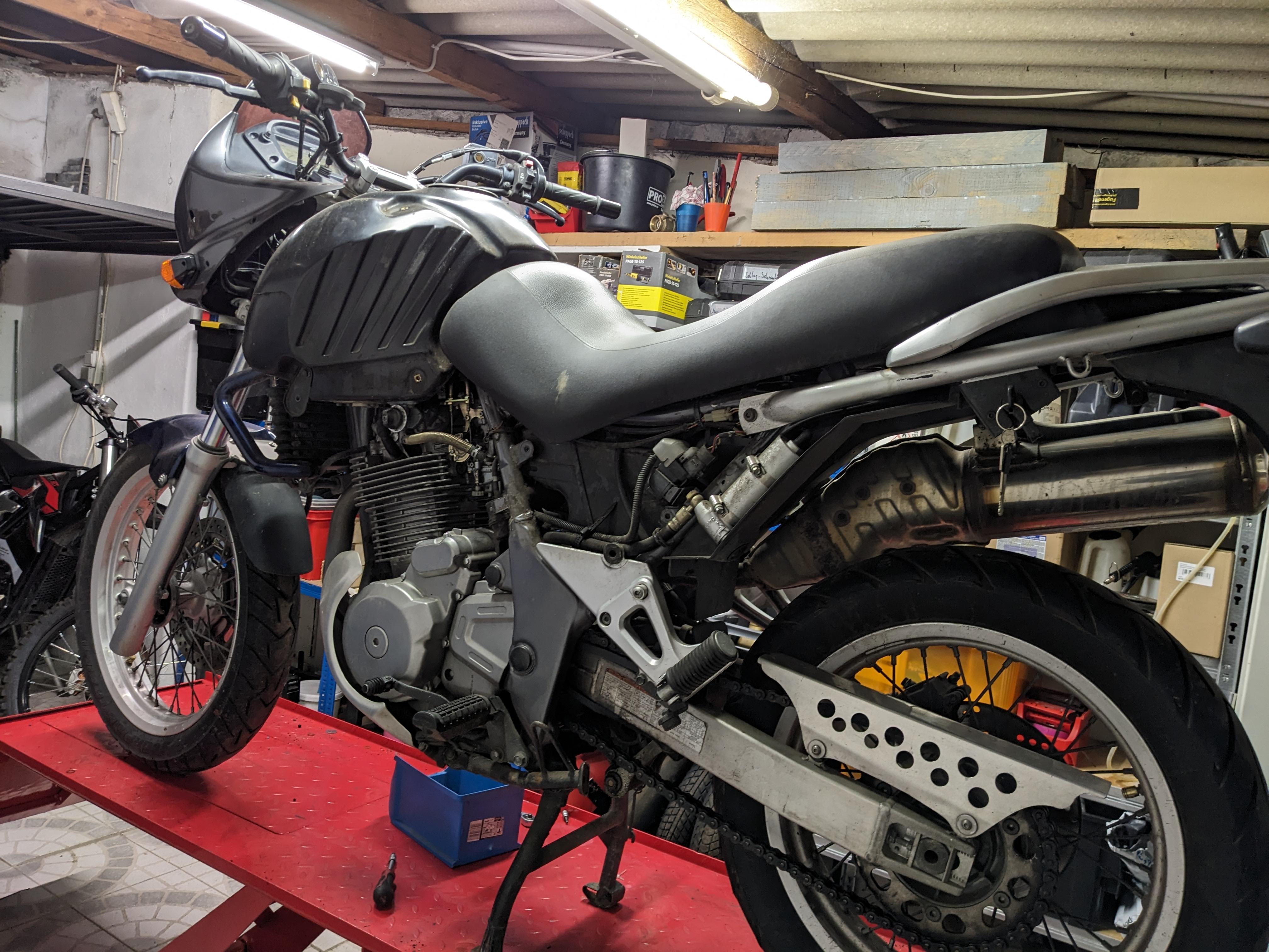 Umbau hab ich geplant, was wahrscheinlich schon viele vor mir gemacht haben, Enduro Maske, hoher Kotflügel, kleines Enduroheck, dicker Krümmer, Endtopf usw. und soviel weg lassen wie möglich...