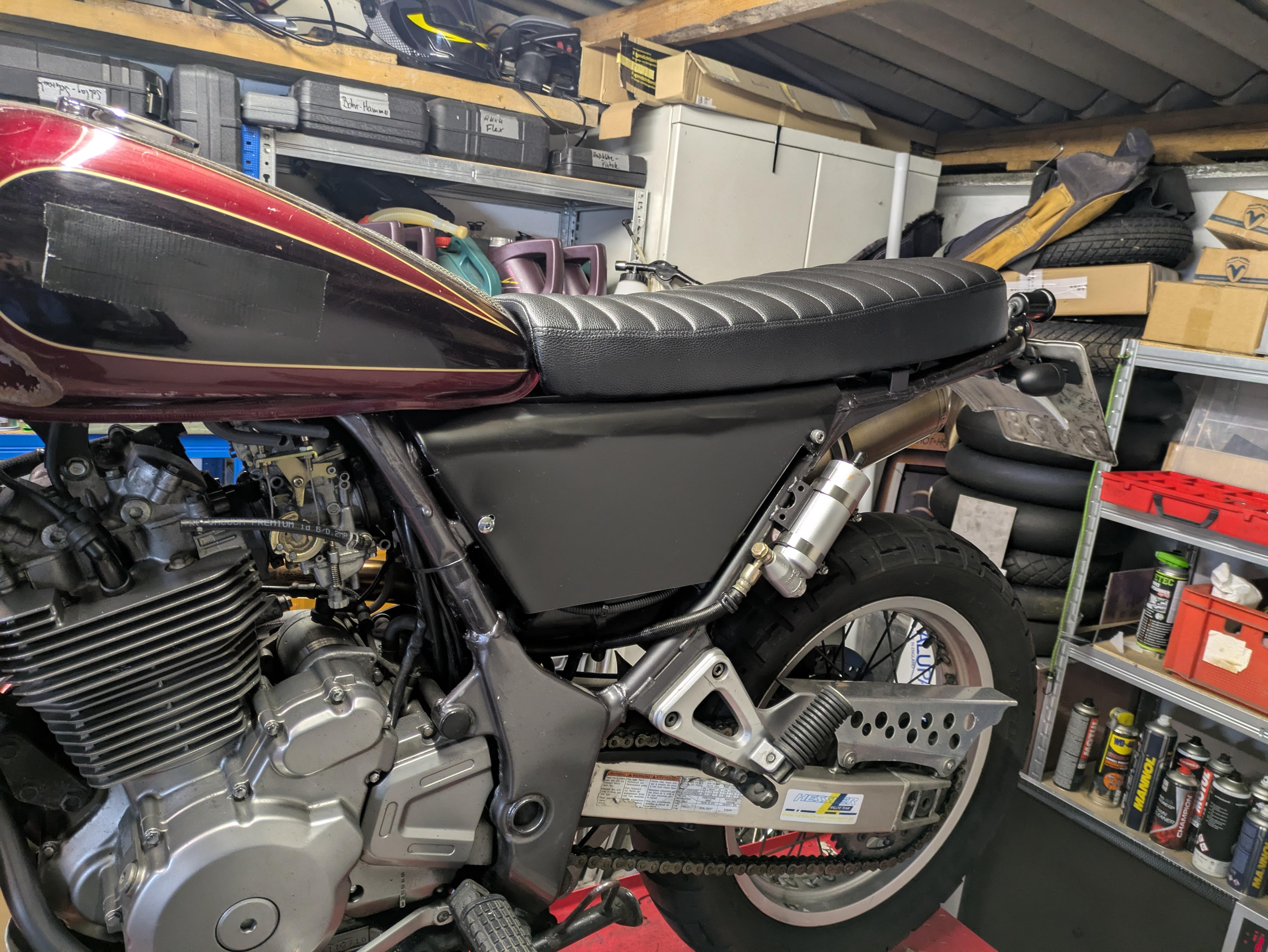 sieht ja schon recht fertig aus, der Seitendeckel ist gut gelungen, finde ich. Je nach Baujahr und Zulassung könnte das hintere Schutzblech zu kurz sein, aus früheren Zeiten als ich noch zum TÜV fuhr weiß ich, dass das Kennzeichen nicht als Schutzblech zählt. Diese Verlängerungen nur für Deutschland sahen sehr gruselig aus.