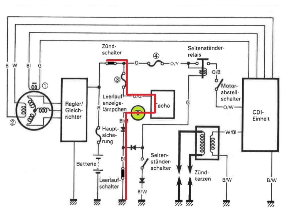 Falls nicht, liegt der Fehler an der Lampe, an der Diode, am Kabelbaum oder an Kontaktproblemen im Tacho oder an der Sicherung 3