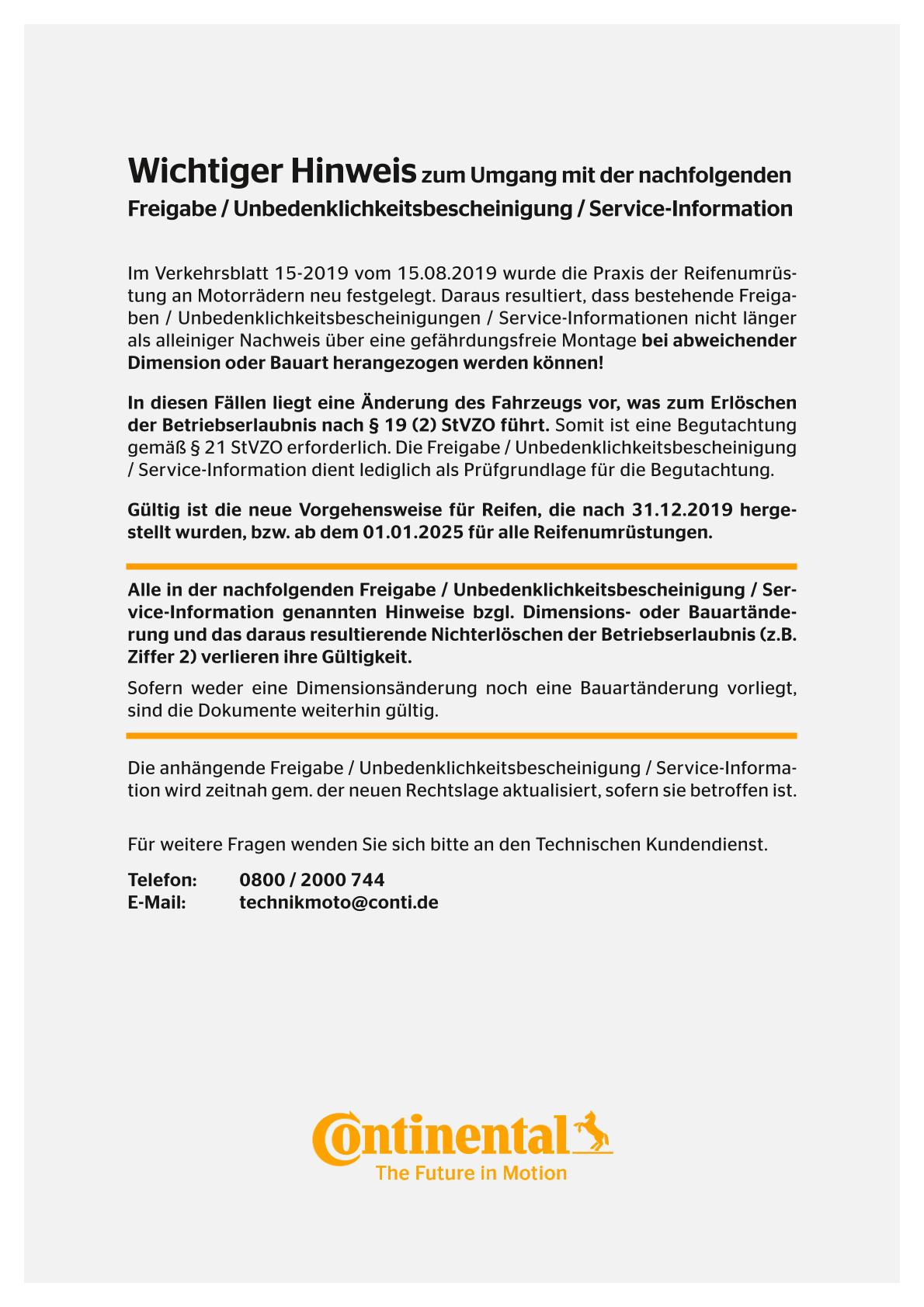 Gefahrene Reifengröße: 110/70-17 und 160/60-17 (Unbedenklichkeitsbescheinigung seitens Conti vorhanden und mitgeführt!)