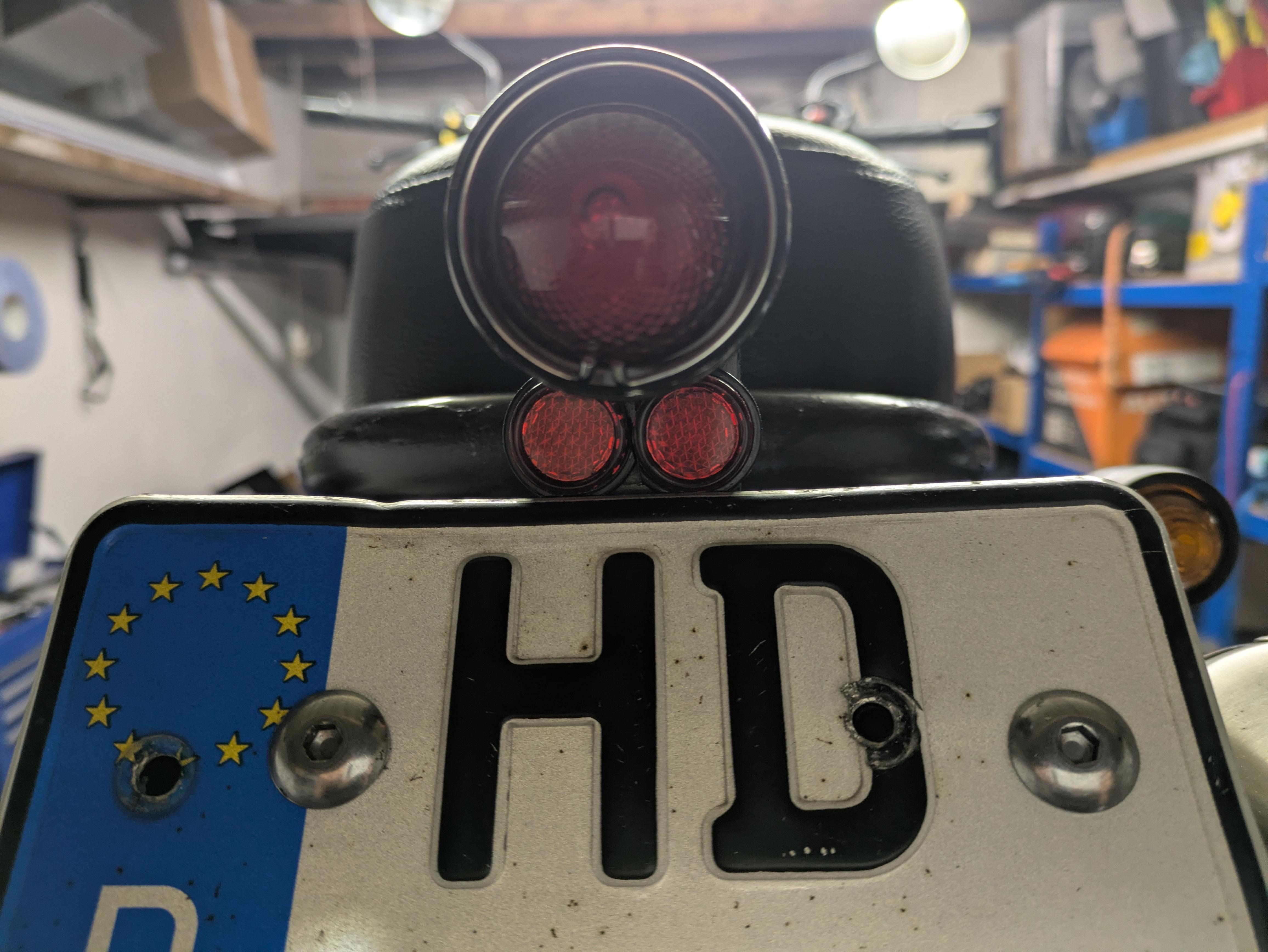 Ich hab noch ein Bild von den Spiegeln gemacht, die haben tatsächlich ein Alugehäuse, also komplett aus Metall, und die Rückstrahler, die finde ich besonders putzig, ich hoffe die Gesetzeshüter auch .... Die blauen Bremsleitungen werden übrigens noch durch schwarze ersetzt.
