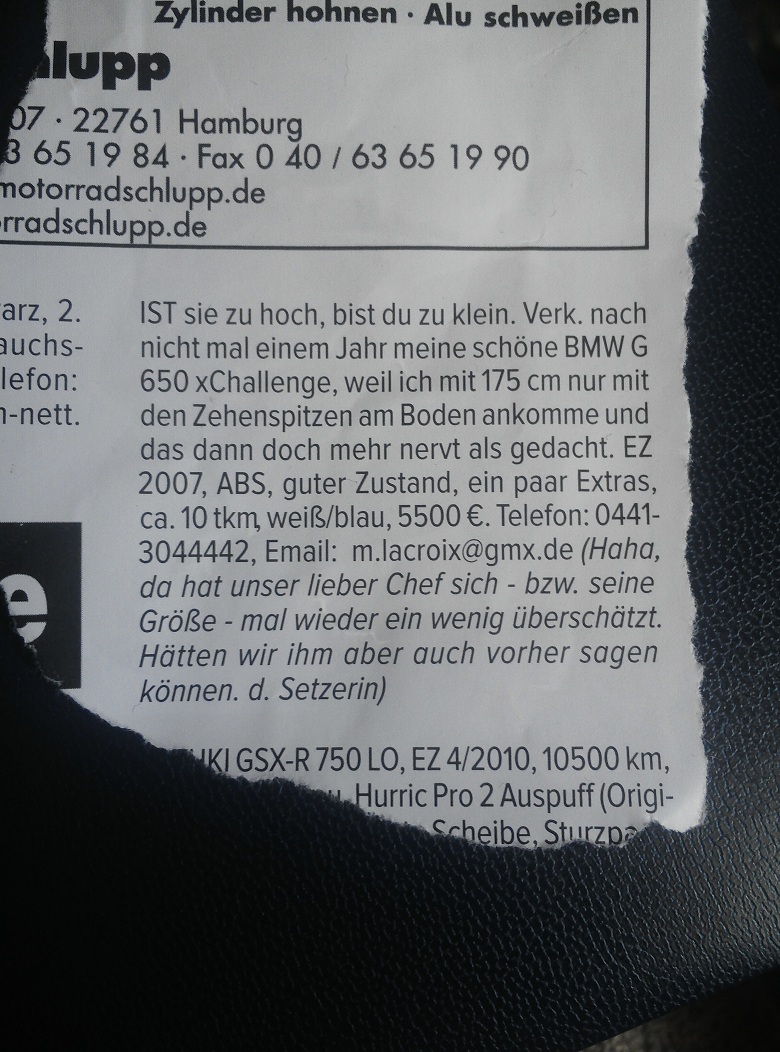 Ich musste da gerade nur an meine Bereitschafts-Kammeradin denken, die ihre gute 1100er Virago verkaufte da sie sich eine Husaberg Supermoto einbildete.