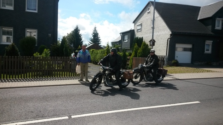 am nächsten tag war leider ein regengebiet angesagt, sodaß wir nicht weiter nach osten, sondern zügig nach thüringen fahren wollten. von au bis schleiz konnte ich so meine conti trail attack´s ausgiebig testen - sind wirklich tolle regenreifen - , aber thüringen verwöhnte uns dann bis saalfeld mit feinsten, trockenen kurven. da ich den zweiten tag die tour anführen durfte, war suzi ganz in ihrem element, und freddy (bmw1150 RT) und ferdl (Honda 750 Integra) hatten eine riesige freude, ihr zu folgen. das sind natürlich nicht freddy und ferdl, sondern zwei bmw-veteranen, die wir an einem cafe in thüringen getroffen haben.