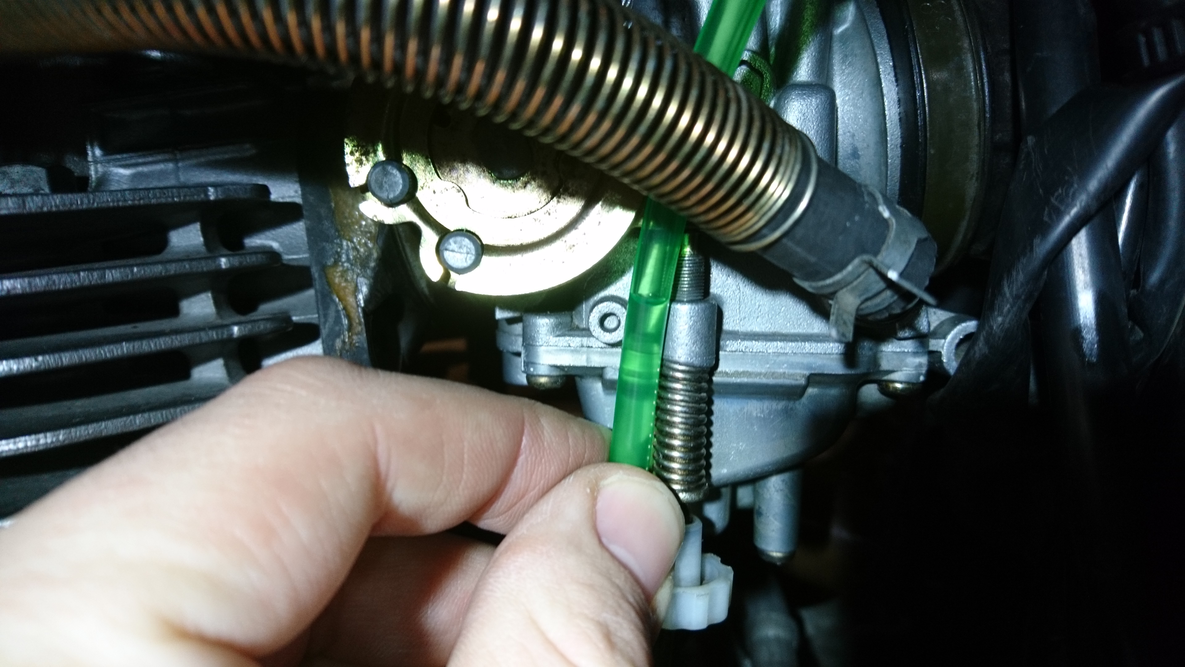 2. Doch etwas Falschluft? Beim erneuten Absprühen mit Bremsenreiniger ergab sich hier eine minimale aber reproduzierbare Auffälligkeit. Am Ansaugstutzen links Luftfilterkasten. Ich tippe auf Lufi Seite, am Vergaser ist alles rund, geschmeidig und nichts eingeklemmt etc.