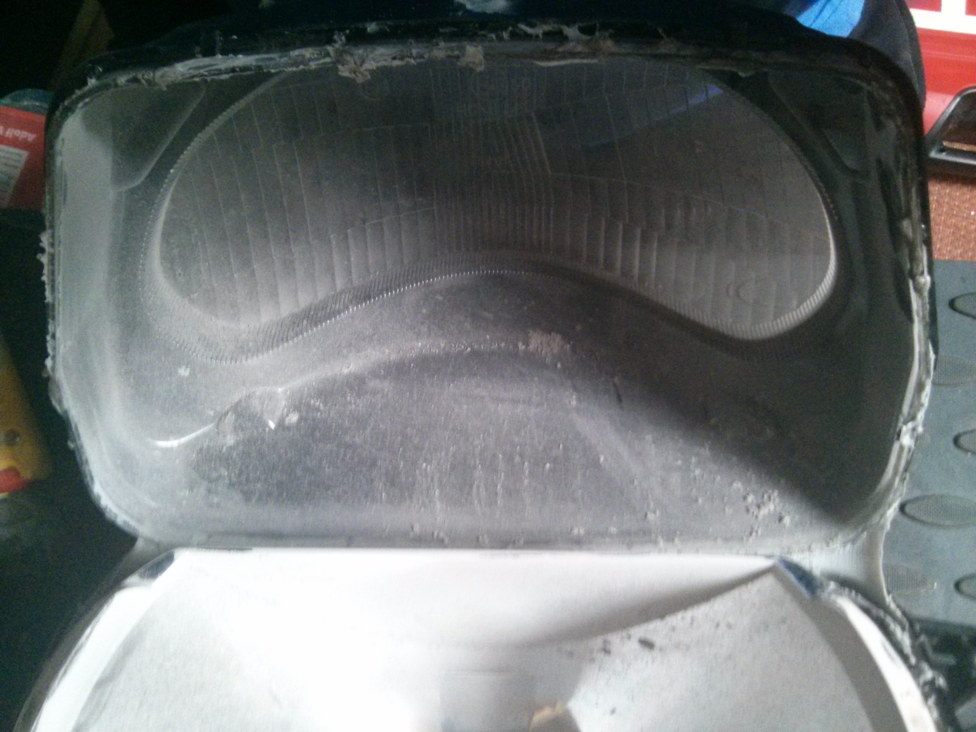 Ich habe mich am Wochenende mal an die Sanierung des Scheinwerfers begeben. Die Dichtungsmasse ließ sich nach einer halben Stunde bei 60 ° C Umluft im Backofen leicht überreden loszulassen. Nichts ist abgebrochen! Anschließend alles auseinandergenommen und gereinigt.