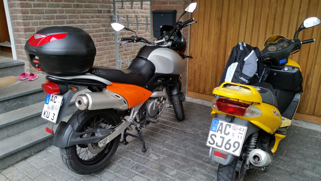 Reparaturkosten wären um die 450,- Euro, und ich hatte seinerzeit 780,- Euro für den neuen "Bausatz" bezahlt (ja, der kam als Bausatz an - übrigens mit TÜV - und ich habe ihn dann an einem langen Nachmittag zusammengeschraubt - also wie früher beim Lego ...). Ich war sehr unglücklich und sagte meinem Bekannten, dass ich mich melde. Zwischendurch sah ich aber dann in einer Kleinanzeige ein Bild der XF und erhielt damit die Frage, wie es denn mal wieder mit so was wäre. Was soll ich sagen, ich dachte eigentlich nur, dass Rollerfahrer ja eigentlich sowieso keiner grüßt 8)