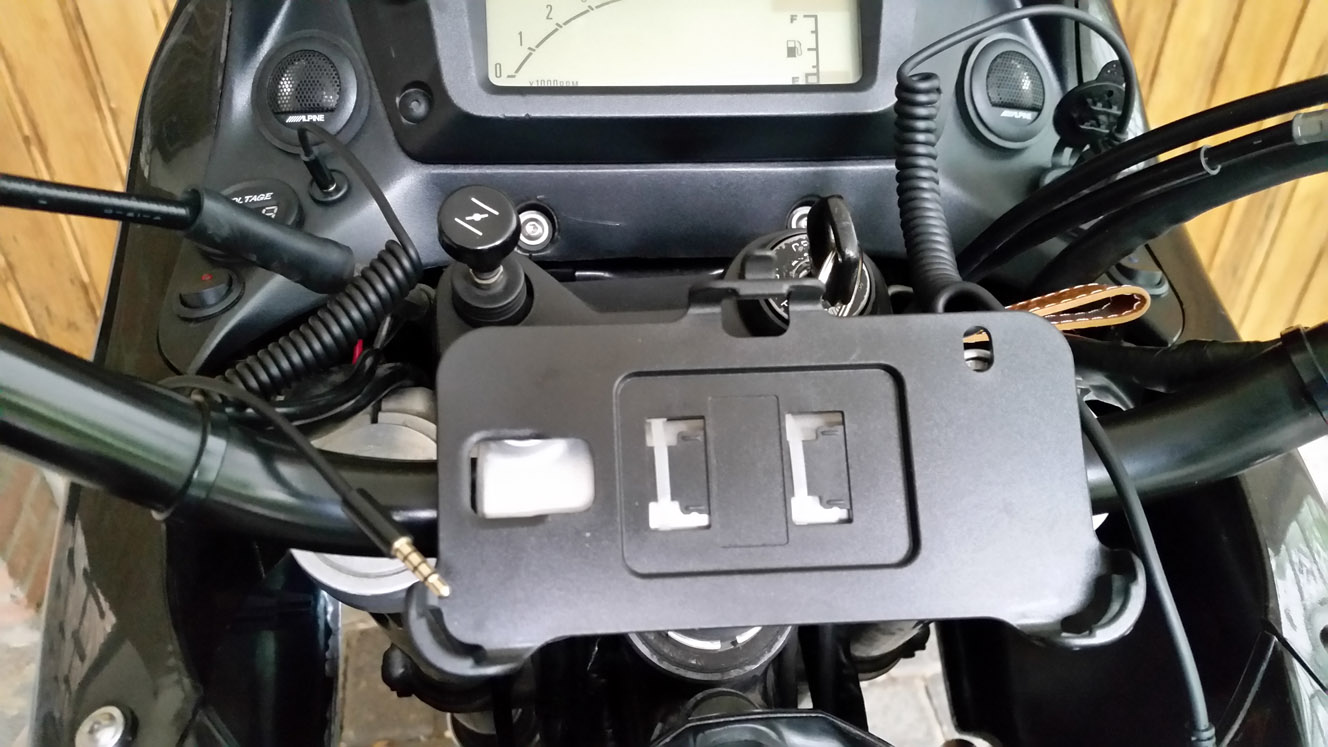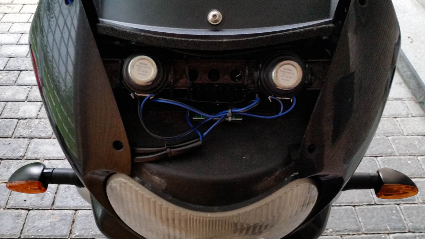 Die Lautsprecher - das sind wirklich nur die Hochtöner - können mit Hilfe des kleinen Verstärkers hinter dem Scheinwerfer durch ein x-beliebiges Audiogerät über den Klinkeneingang angesteuert werden. In meinem Fall ist das ein Smartphone. Ich habe zudem aber auch vor, irgendwo hinter der Verkleidung noch einen Bluetoothempfänger zu platzieren. Dann entfällt die Verkabelung. Etwas "sogenannten Bass" gibt es noch durch die beiden hinter dem Scheinwerfer platzierten kleinen "Basslautsprecher". Fühlen kann man die im Betrieb aber nicht ... :wink: