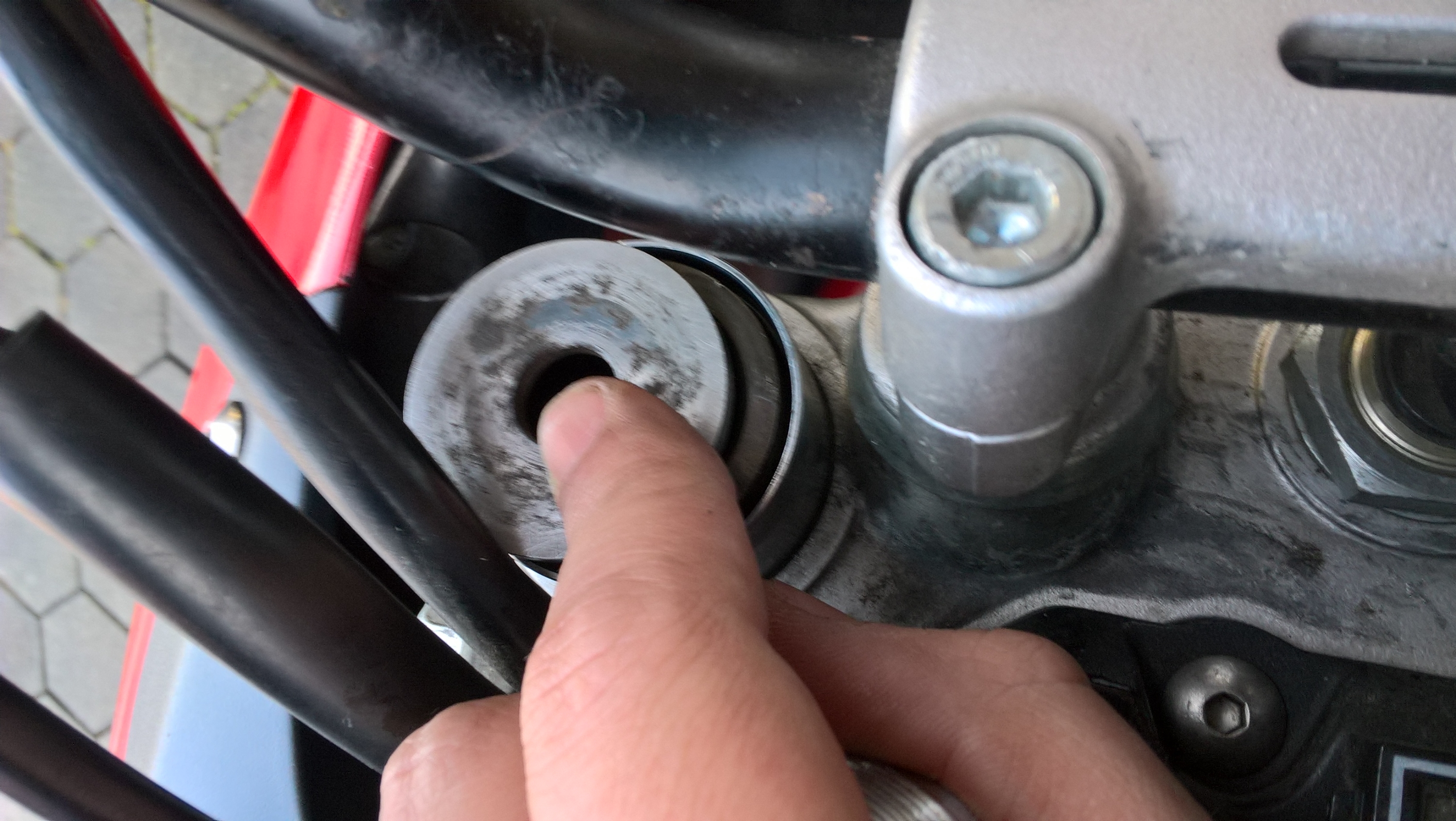 Bild mit Stander Nach dem Einbau des Ständers hab ich endlich die Möglichkeit gehabt dem Motor hochzulegen. Die Vorbesitzerin war ziemlich klein und hat es hinten tiefergelegt (obere Loch im Feder). Dabei muss ich sagen war jemand beim Suzuki sehr schlau das man kann dem Schraub rauskriegen aber um dem in den untere Loch zu kriegen muss man den Verbindung (Knochen stuck) abnehmen, grr.