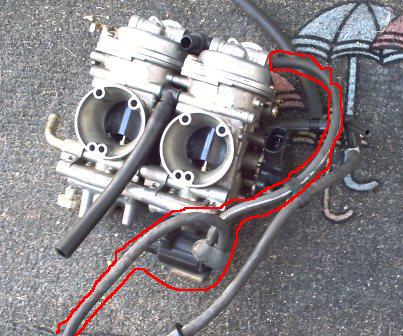 Auf diesem Bild ist in der Mitte zwischen den beiden Vergasern ein dicker Schlauch zu sehen.