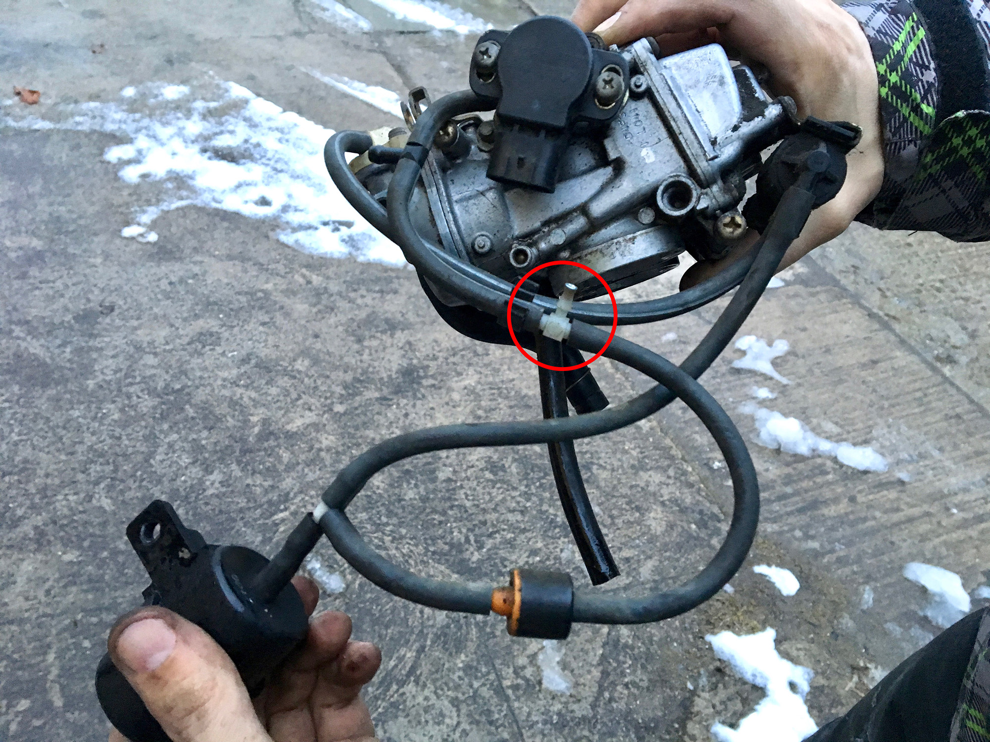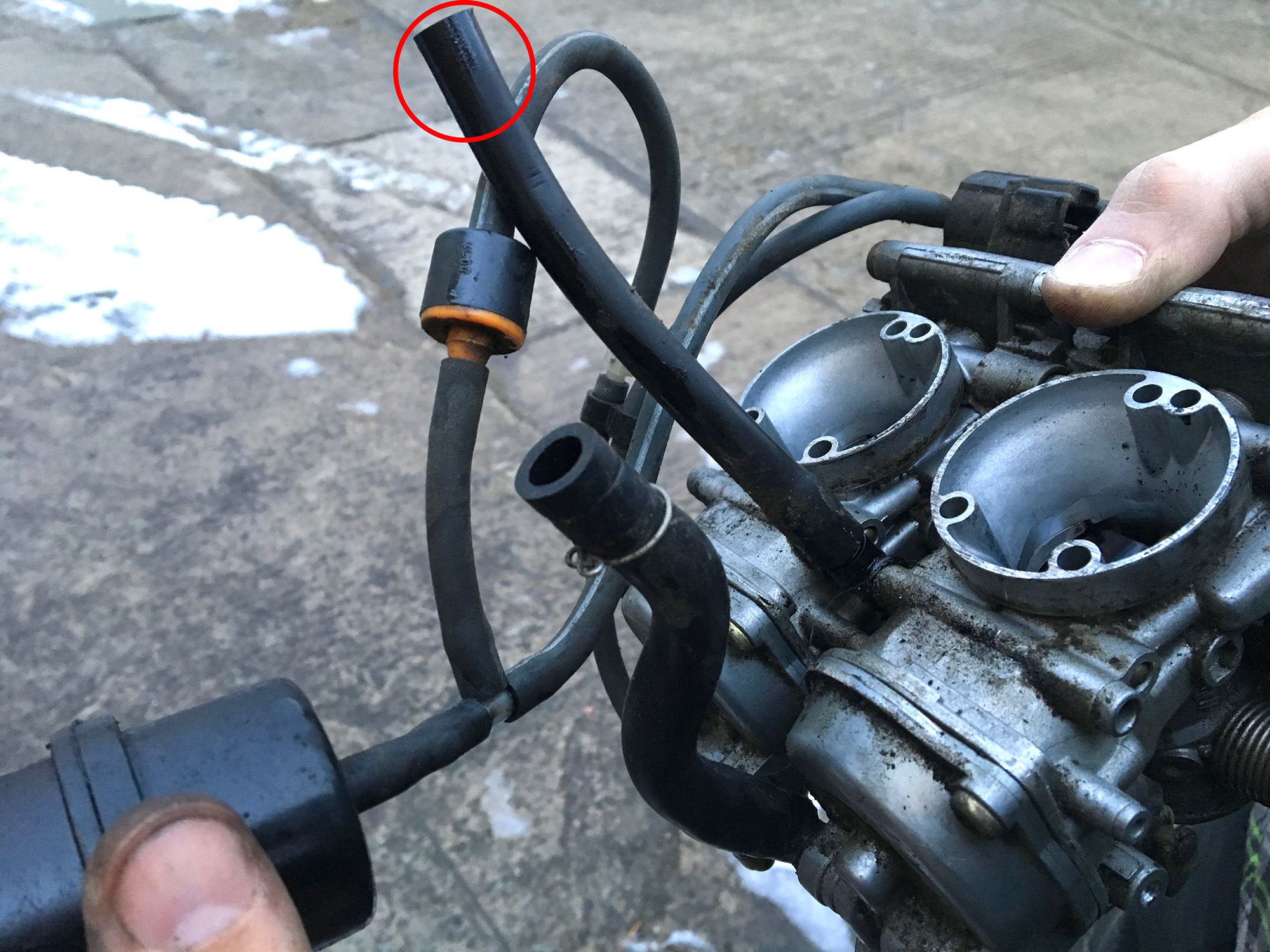 2) Die schmalere Schlauch zwischen den Vergasern war nirgends verbunden und lag nur auf dem Luftfilterkasten auf. Wo muss der hin?