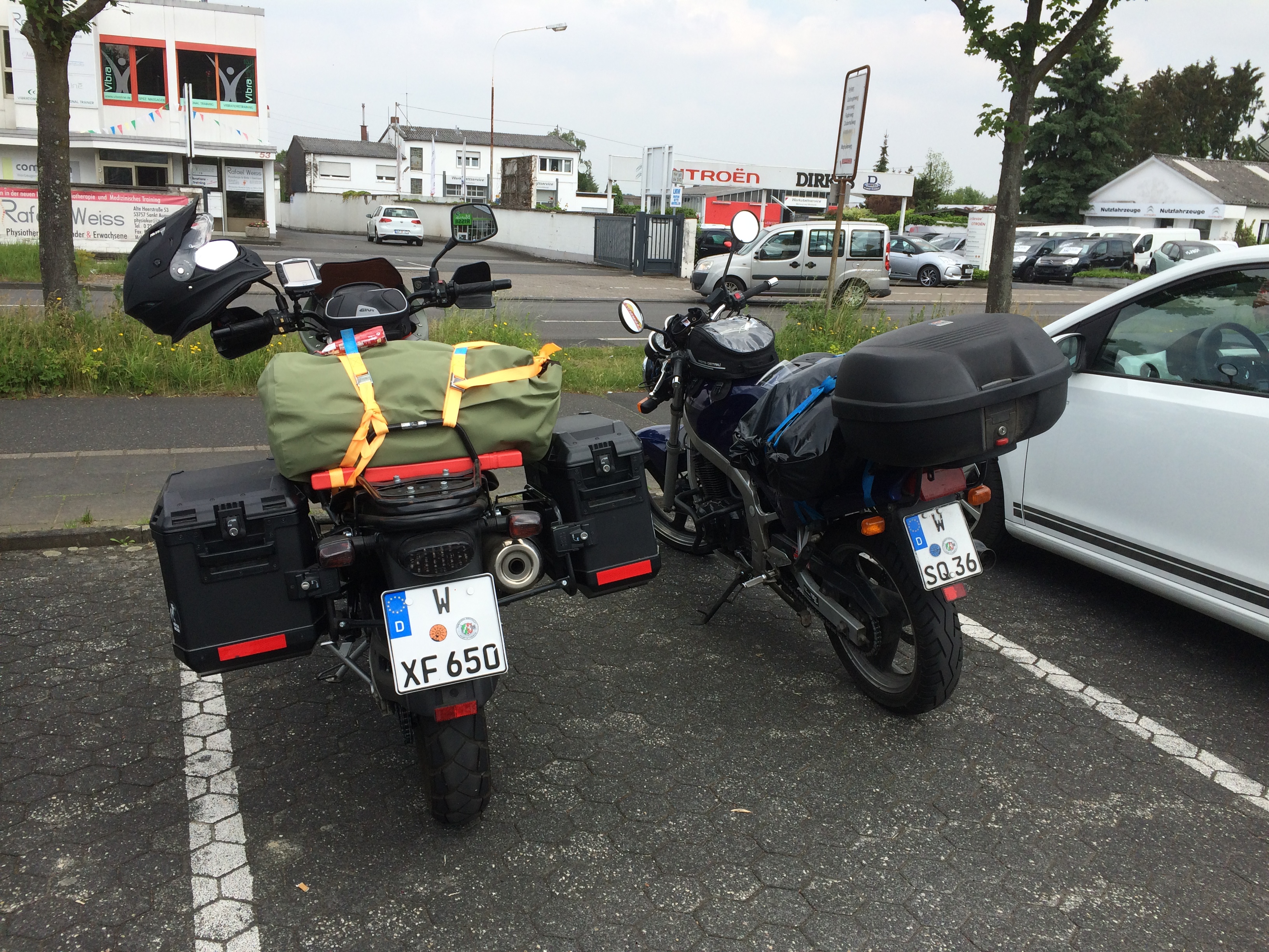 ), werden aber wohl dennoch vor der Sommertour noch gegen Mitas E08 getauscht, weil ich nicht weiß, ob die aktuellen Schlappen noch so eine 3000km-Tour mitmachen. Meine "Sherman-Kombi" (bestehend aus der Vanucci Tanami II-Kombi vom Louis, Modeka Rough Terrain-Stiefeln und ROCC780-Helm) ist bequem, praktisch und bei Bedarf auch hinreichend luftig, die Koffer und der Packsack sind sowieso unschlagbar. Die neue Isomatte (Grand Canyon Cruise 3.0 MP) hält die Luft und hat angenehm kleines Packmaß. Benzinkocher ist sowieso immer praktisch, weil Benzin kann man an jeder Tanke kriegen und man hat's auch immer bei sich. Die Sturzbügelpacktaschen von Heed haben auch dem Regenguss standgehalten und haben sich auch bei einer kurzen Autobahnfahrt nicht vom Fleck bewegt.