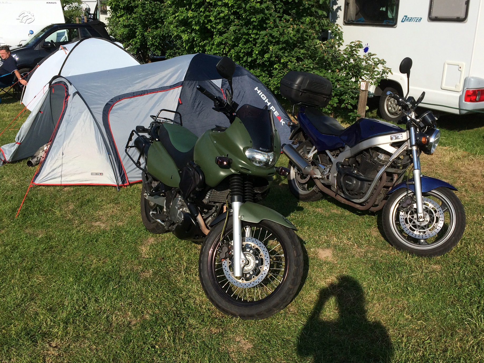 Die Routen (Hinfahrt am Samstag, eine Rundtour am Sonntag und die Rückfahrt am Montag) habe ich mit kurviger.de geplant, als GPX exportiert und mein zumo550 damit gefüttert. Gepackt wurden die guten Xplorer-Koffer und ein 50l-Packsack, auf's Topcase habe ich diesmal verzichtet, da es dann soooo viel Gepäck doch nicht wurde. Im 40l-Koffer fanden Schlafsack (der gute von der Truppe), BW-Isomatte, Kissen, Klamotten, Handtücher und Schuhe Platz, der 30l-Koffer beherbergte die Campingausrüstung (Benzinkocher, Töpfe, Besteck, Vorräte, faltbarer Wasserkanister und eine Rolle Klosettpapier), im Packsack steckten Zelt, Isomatte, Regenkombi und ein bißchen Zeugs für Sherman (Kettenspray, Pannenspray, Ersatzhebel, Ersatz-Leuchtmittel). Außerdem habe ich noch die zwei Sturzbügel-Packtäschchen von Heed angebaut, darin waren dann Warnweste, Verbandskasten, Gepäcknetz und Visierreinigungstücher. Beladen sah die ganze Fuhre dann so aus: