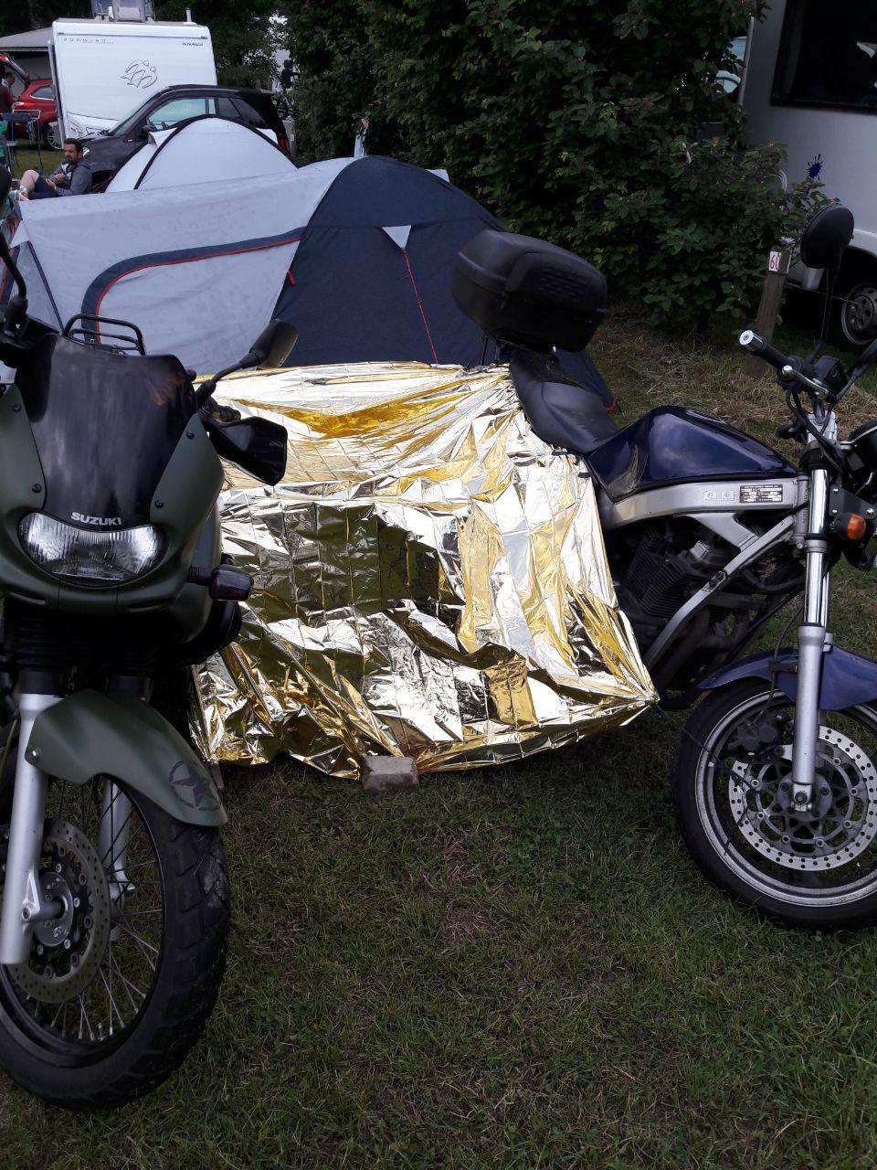 Dann wurde die Wandergruppe von zwei Taxis abgeholt und wir beschlossen, unsere Tour zu beenden und auf dem kürzesten Weg zurück zum Campingplatz zu fahren. Dort hatte zwar der Regen aufgehört, aber es war immer noch mit Nachschub zu rechnen - also wurde kurzerhand mittels einer Rettungsdecke und zweier Moppeds der Stauraum unseres Zelts erweitert.