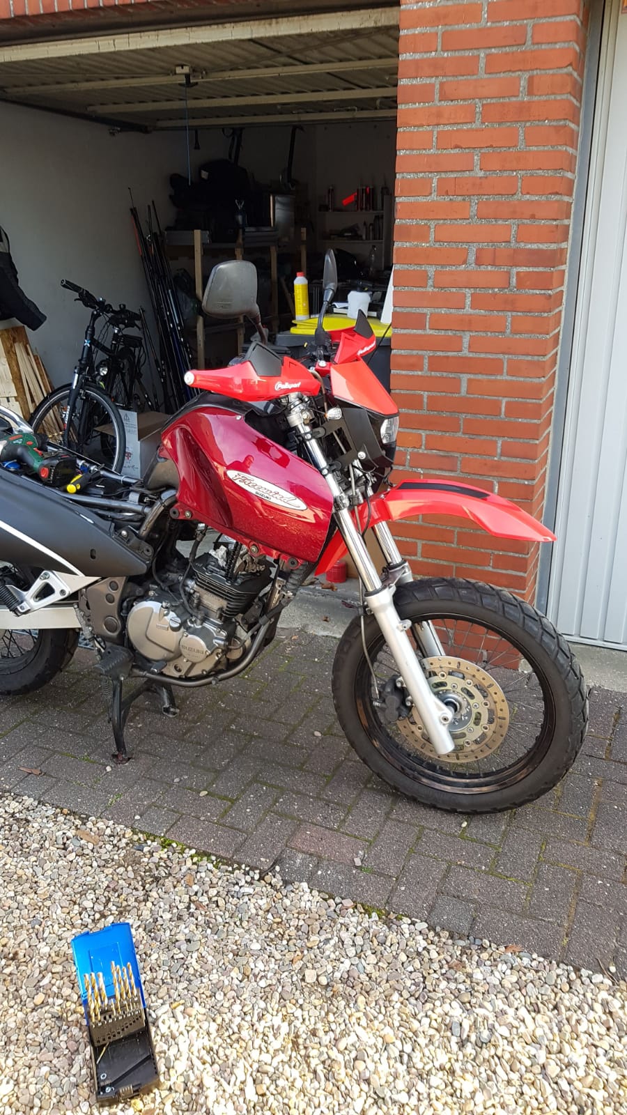 Der auspuff ist noch nicht komplett montiert, da der krümmer ja fehlt. Der hängt recht lose am Motorrad.