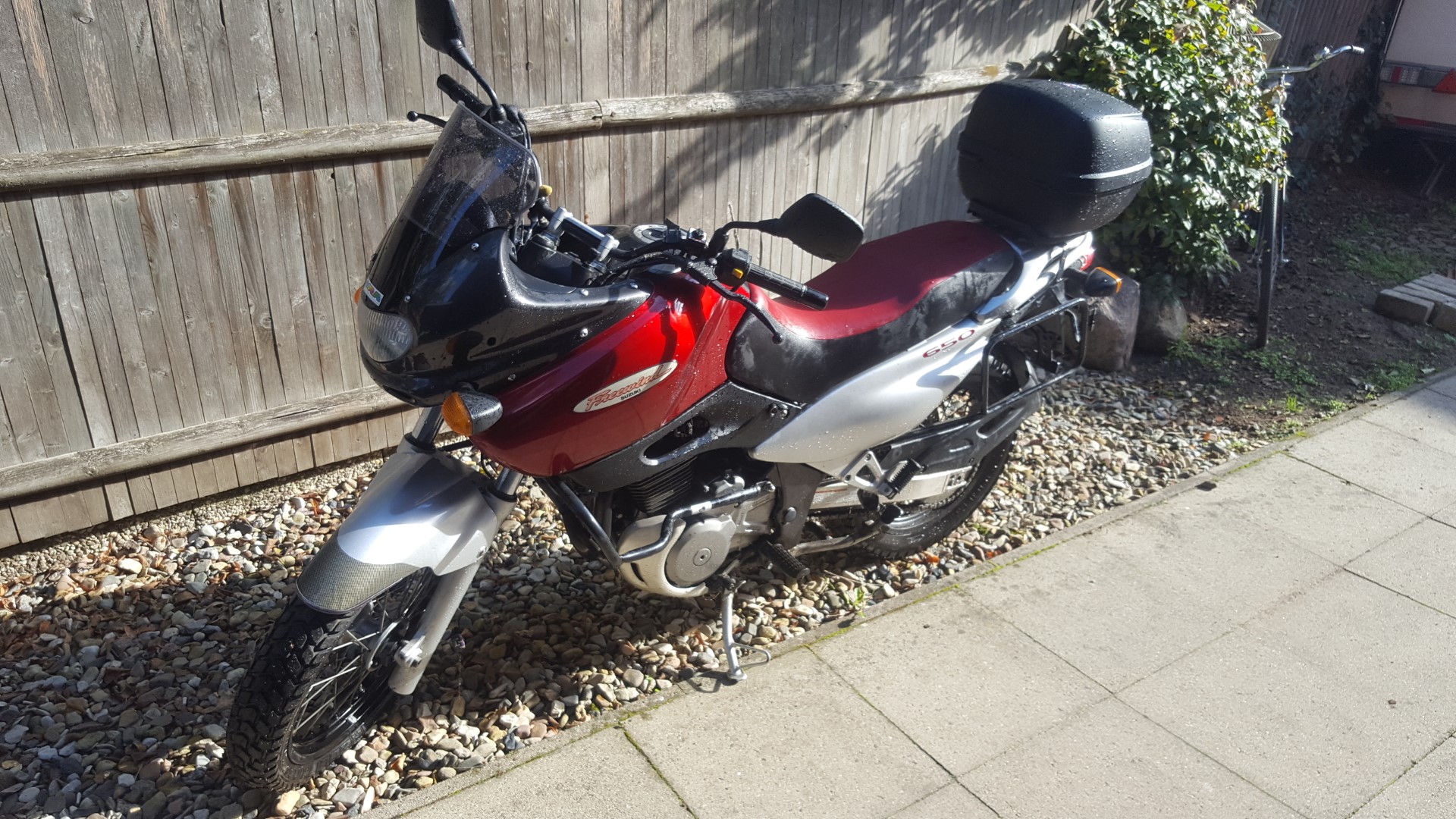 Die Vorbesitzerin hatte diese Neu gekauft und selbst gefahren. Der KM Stand liegt bei 21.253 km. Die Dame hatte auch einige Änderungen an der Maschine vornehmen lassen wie Hepco & Becker Motorschutzbügel sowie die Kofferträger und zugehörigen Alukoffer. Ein Topcase von Kappler, ein Windschild von MRA und einen anderen Gasgriff. Eine Griffheizung ist ebenfalls vorhanden.