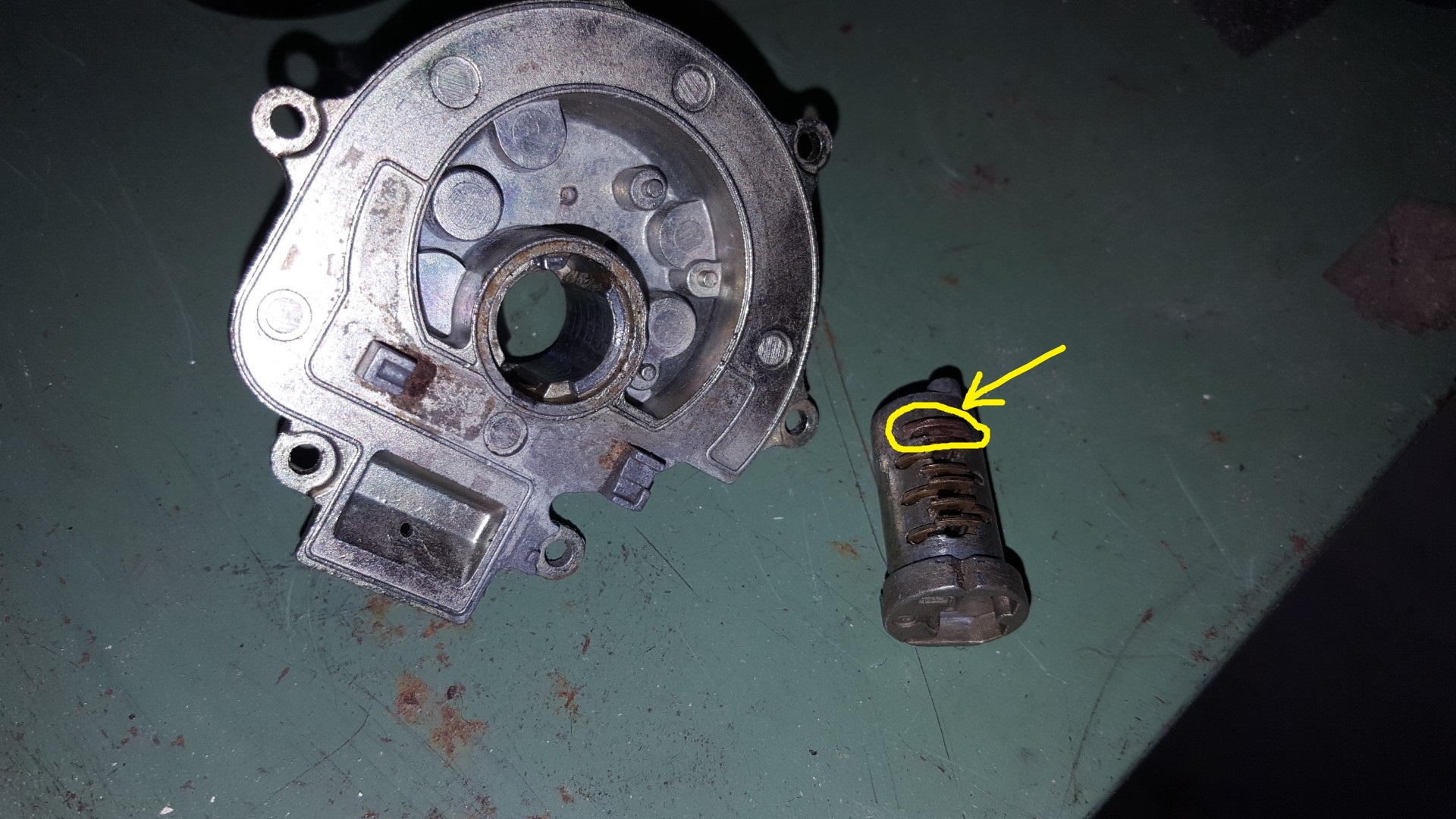 So sieht der ausgebaute Zylinder aus. Eingekreist ist hier das Plättchen welches ich erwähnt habe.