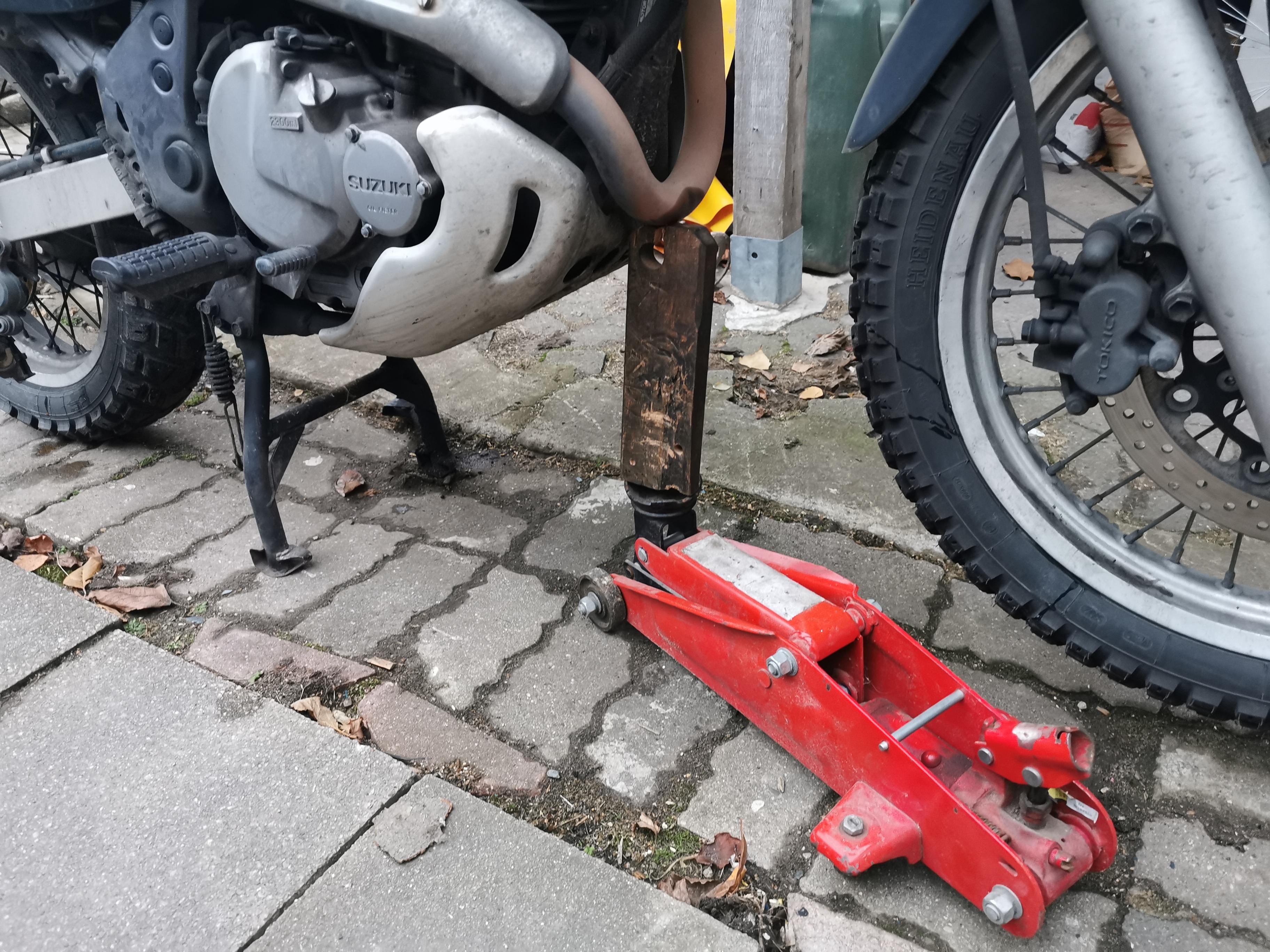 Im Gegensatz zu den beiden Steinen im Kettensatzwechselthema hebe ich das Motorrad mittels Wagemheber am Krümmer vorn an, bis das Hinterrad auf den Boden kommt. So kann man auch praktisch die Hinterachse entlasten.