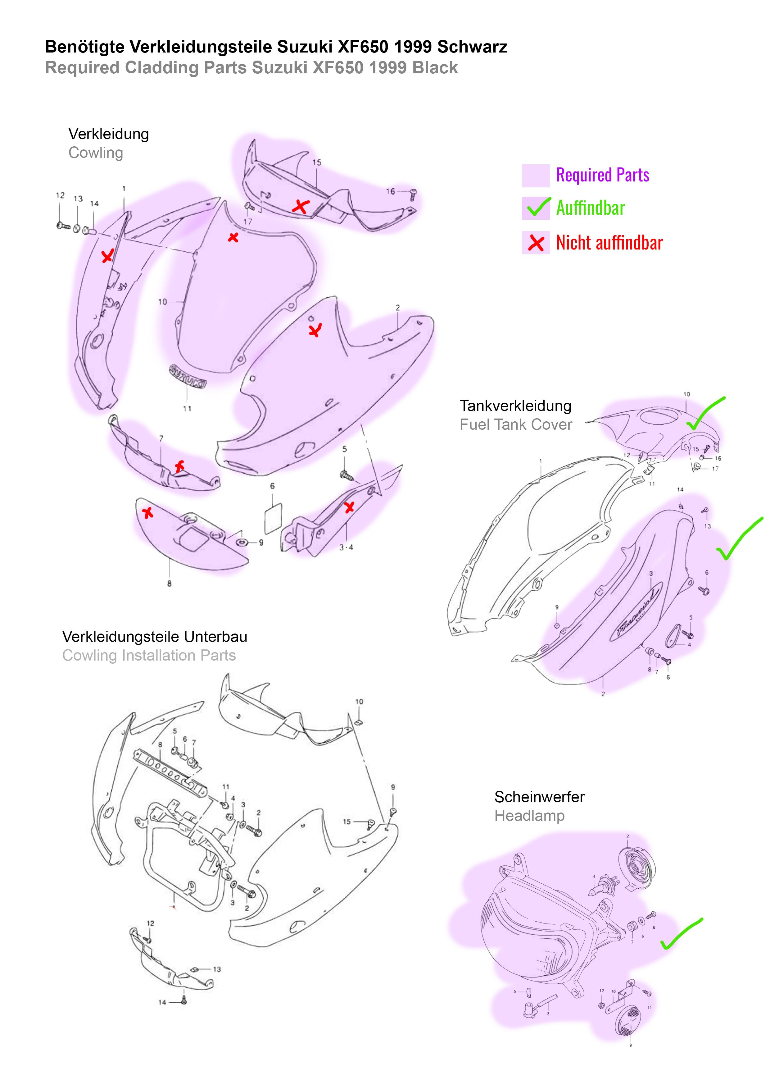 Da ich wie in (1) erwähnt schon zuviel Geld für meine Dummheit und das Motorrad ausgegeben habe, sehe ich mich gezwungen nun so sparsam wie möglich an die Sache ran zu gehen. Ich will versuchen das Motorrad selbst zu reparieren und die beschädigten Verkleidungsteile gebraucht zu erwerben.