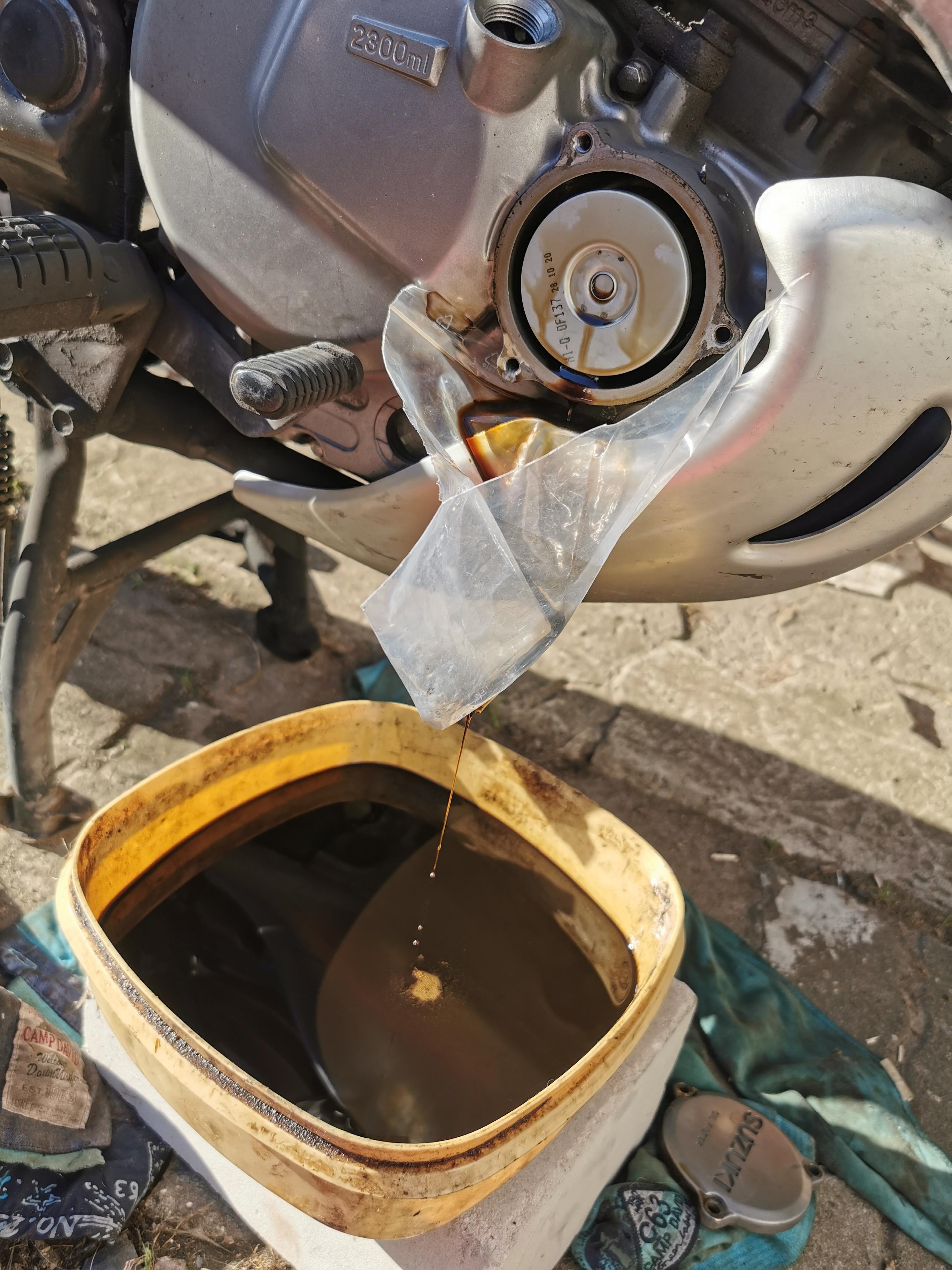 Da ich kein Gelände fahre habe ich die Schutzwanne abgebaut, etwas zur rechten Seite neigen, abstützen und die Suppe läuft reibungslos ab.