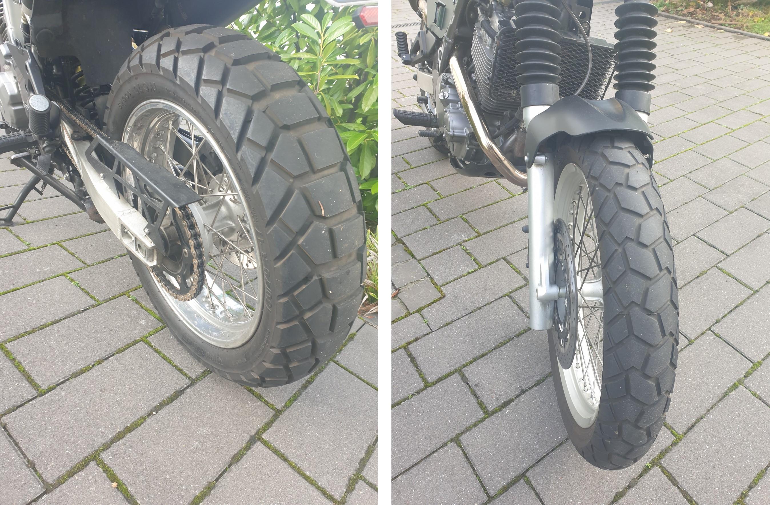 Zwei Runden je 150Km bin ich mit den Reifen gefahren dann habe ich die Räder ausgebaut und Conti TKC70 aufziehen lassen. Eine Empfehlung von einem Freund der sie auf seiner BMW fährt und ich finde die Dinger klasse.