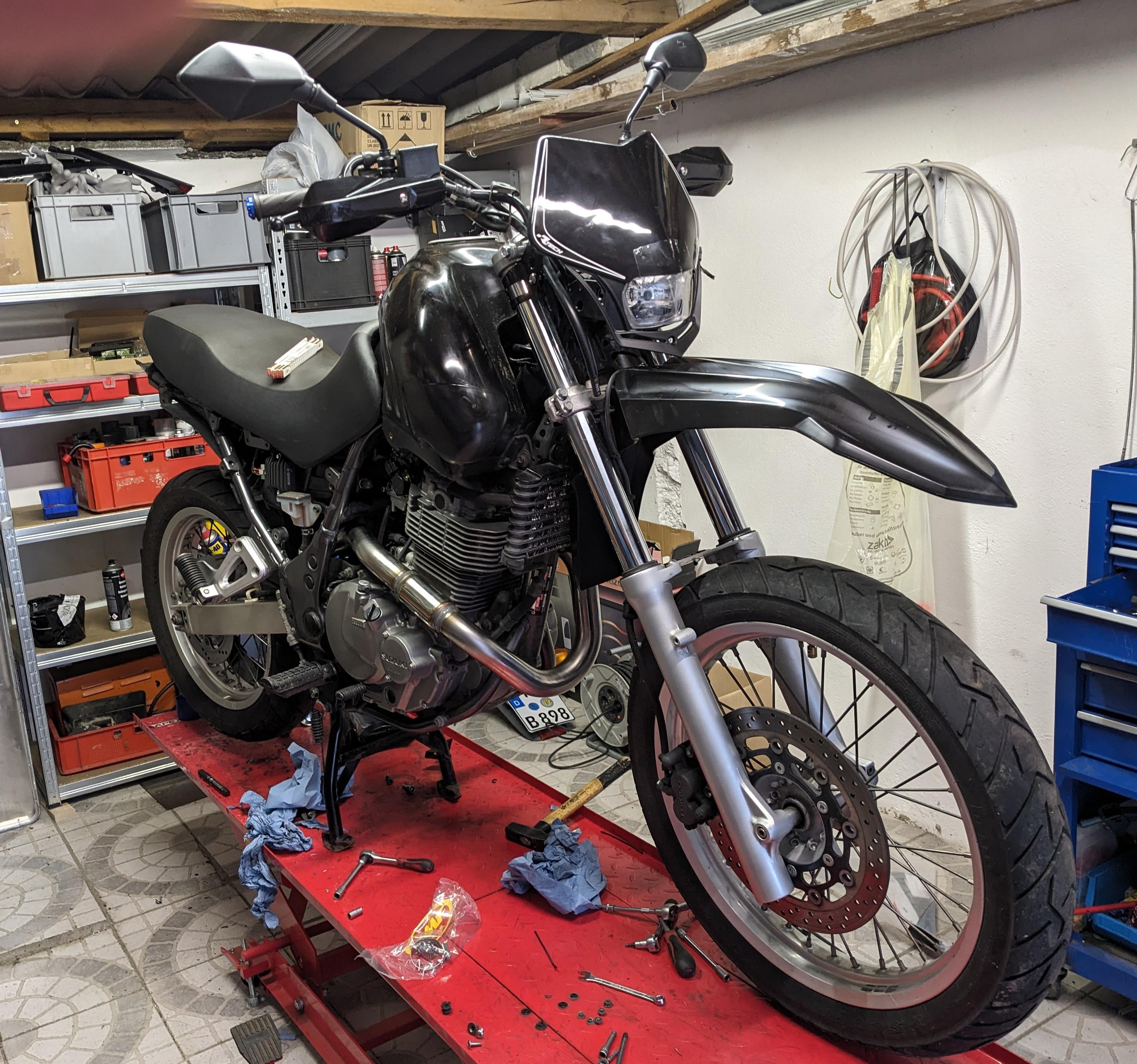 Gabel und Stoßdämpfer von der DR650 SE sollten passen und das Vorderrad der XF neu mit 21er Nabe einspeichen.