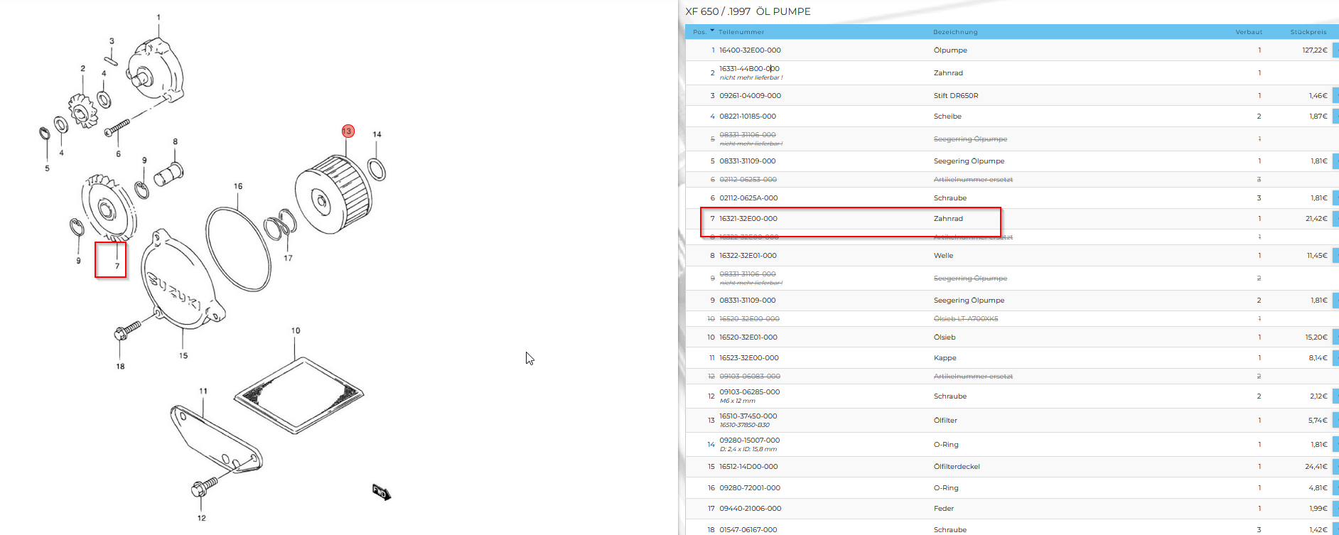 laut Teilekatalog hat das Zahnrad die Nummer 16321-32E00-000 und kostet knapp 20 Schleifen. Wenn man sorgsam ist, kann man die beiden Seegerringe wiederverwenden. Wer es ganz gründlich machen will, tauscht auch die Welle auf der das Rad läuft. -> 16322-32E01-000