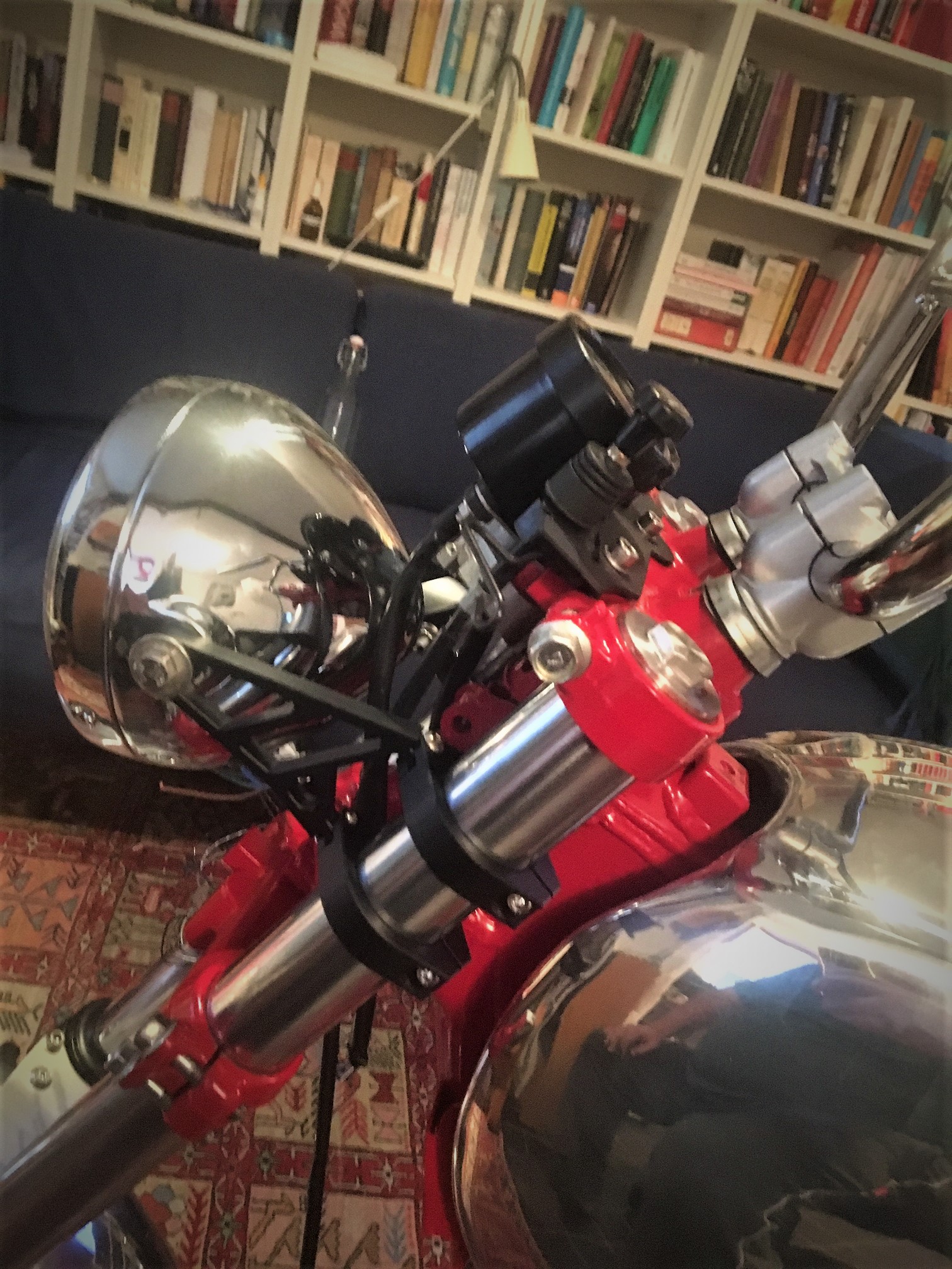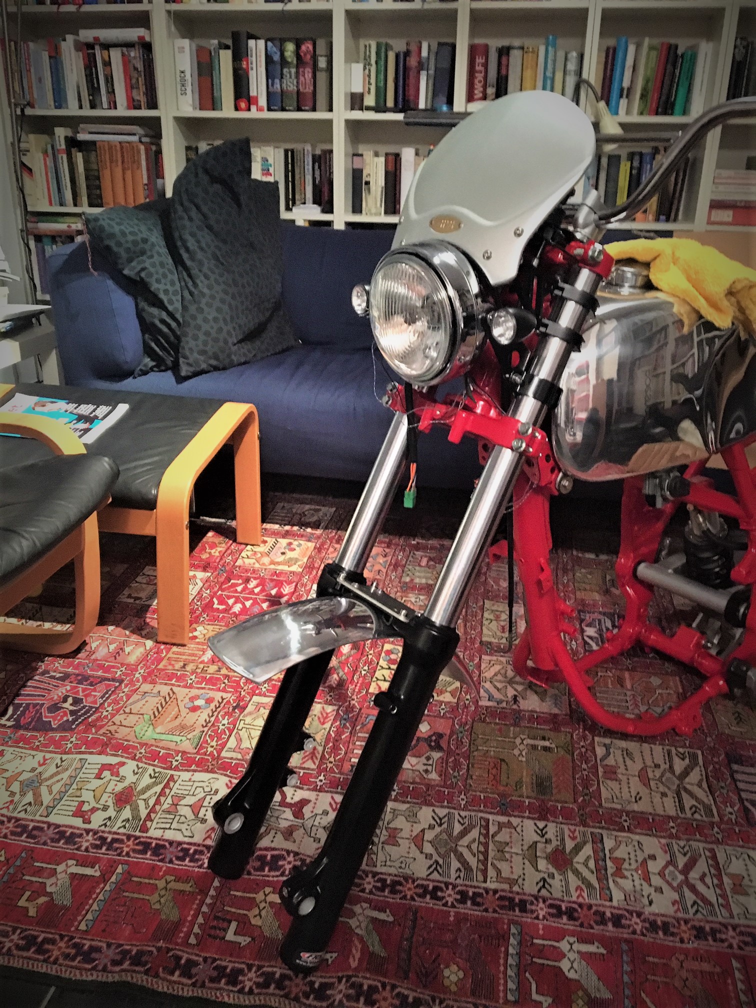 Gabelholme sind fertig, mit Wilbers Federn und auf mein Gewicht eingestellt. Armaturen sind dran, Lenker ist dran, Lampe ist dran, Gabelstabi ist dran, Kotflügelvorne ist dran, Blinker vorne und hinten sind dran.