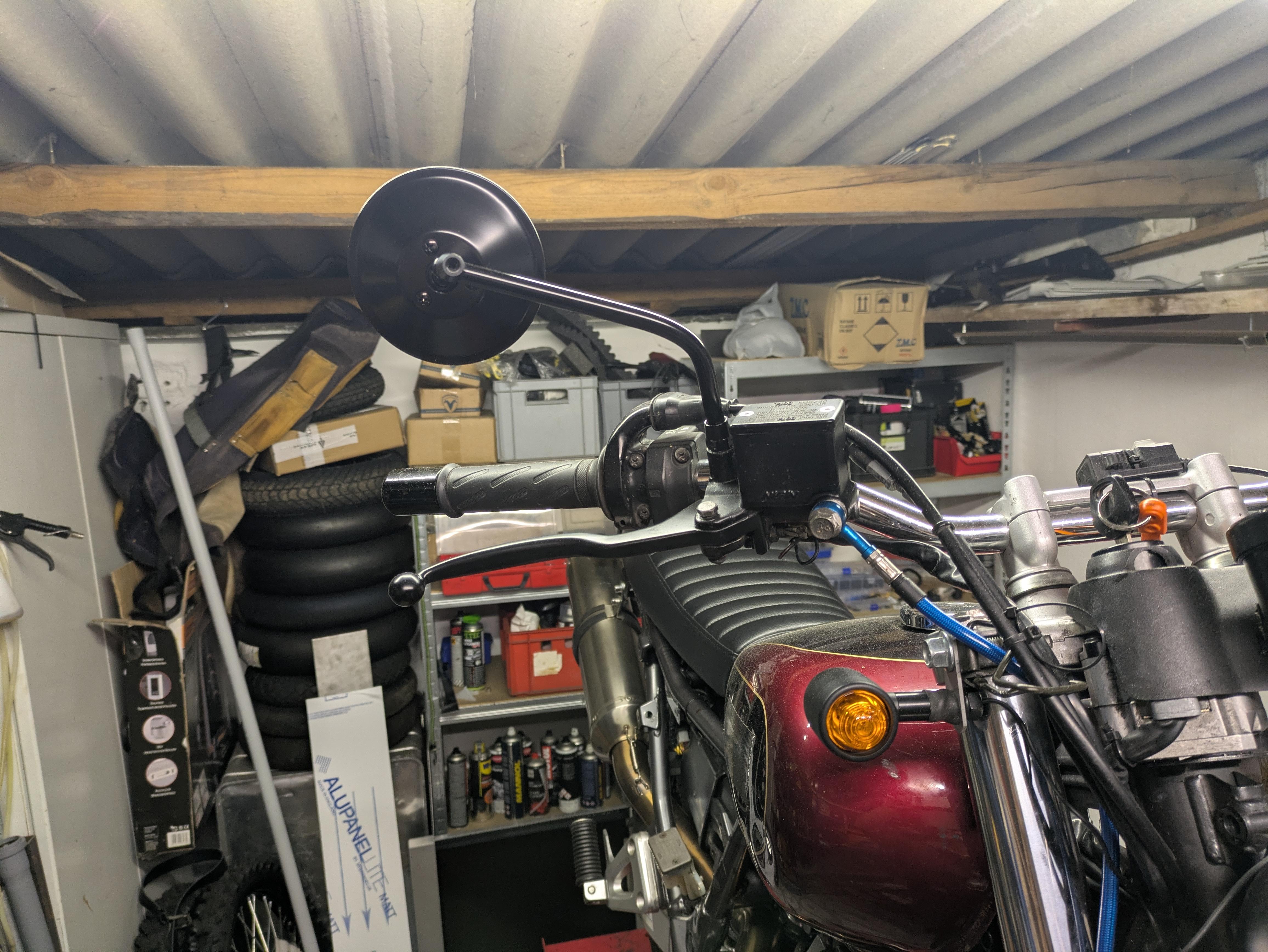 Ich hab noch ein Bild von den Spiegeln gemacht, die haben tatsächlich ein Alugehäuse, also komplett aus Metall, und die Rückstrahler, die finde ich besonders putzig, ich hoffe die Gesetzeshüter auch .... Die blauen Bremsleitungen werden übrigens noch durch schwarze ersetzt.