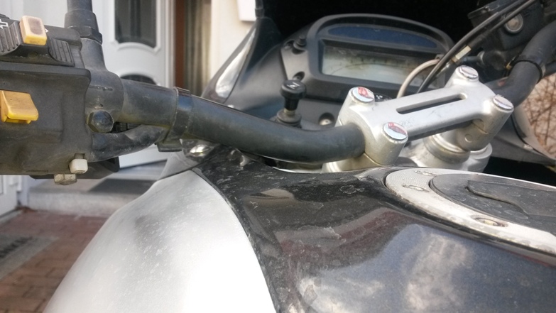 kannst somit den lenker um ein paar cm anheben,so das er den tank nicht mehr anstößt.eventuell stößt er die scheibe auch nicht mehr an,weil der lenker dadurch auch ein wenig nach hinten rückt.(neigung der klemmböcke leicht zum fahrer)