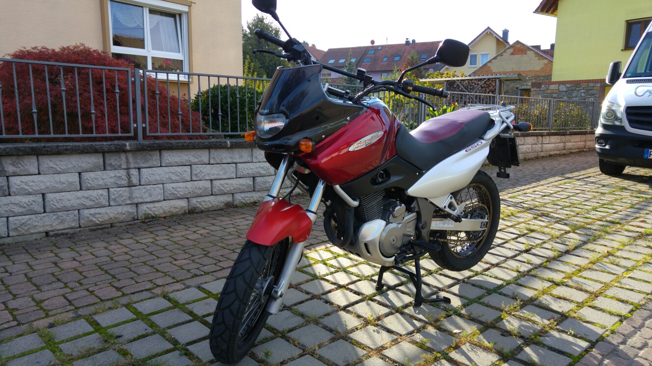 Einen Sturz und einen Unfall haben wir mit ein paar Restschäden beide gut überwunden und in diesem Jahr war ich mit ihr auch wieder zum Treffen in Oberzeusheim. Das Verhältnis zu diesem Motorrad war immer ambivalent. Ich hatte sie kurzfristig erworben, nachdem eine 500er MZ ein paar Wochen nach dem (Gebraucht-) Kauf mit Motorschaden ausfiel. Die Sitzposition war für mich (188 cm) nie ganz ideal und mein Poppes hat sich wegen fehlender Dauerübung auch nicht ganz an sie gewöhnt. Aber Spaß macht sie doch, vor allem, wenn man wie ich am Kaiserstuhl zwischen Schwarzwald und Vogesen wohnt. In den vielen Kurven zwischen 100 und 1200m ist sie sehr agil und leicht zu fahren. Aber längere Etappen auf der Autobahn ertrage ich nur unwillig.