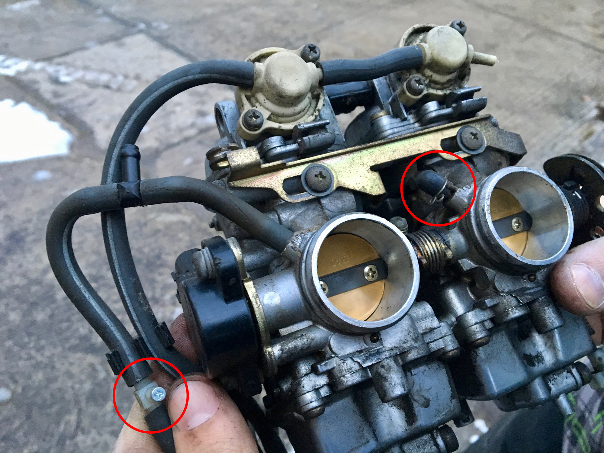 2) Die schmalere Schlauch zwischen den Vergasern war nirgends verbunden und lag nur auf dem Luftfilterkasten auf. Wo muss der hin?