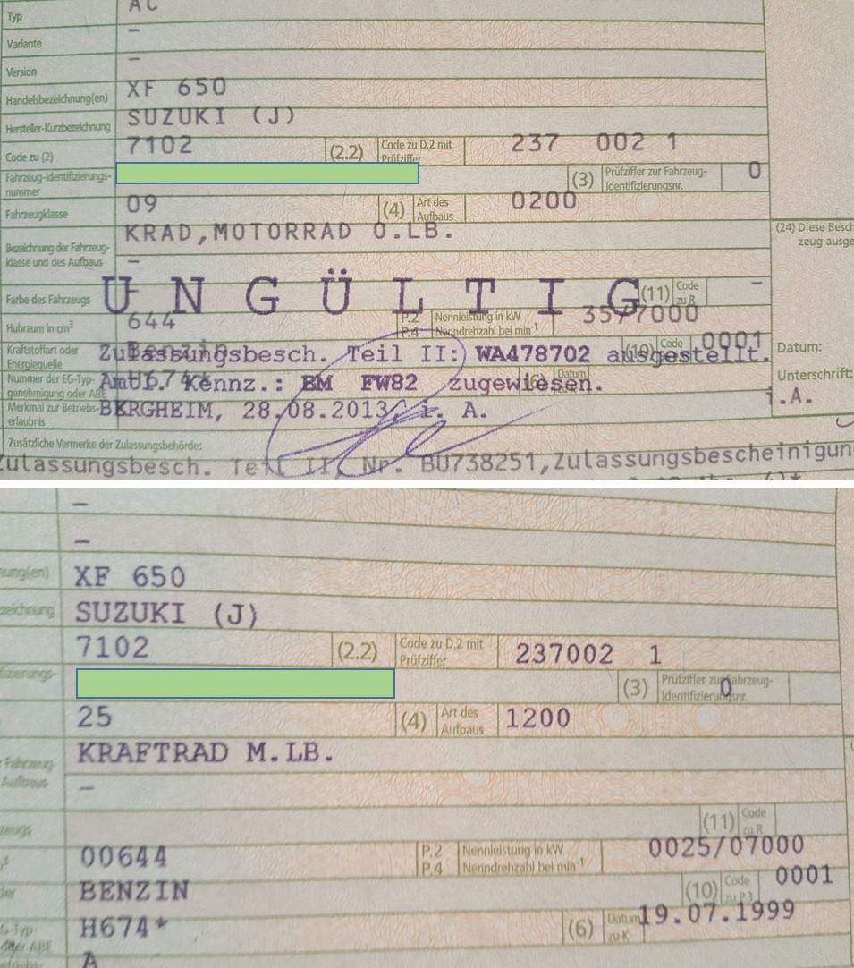 Hallo, hier mal ein Auszug aus einem alten, ungültigen Brief und dem aktuellen ("Krad, Motorrad O.LB" und "Kraftrad M.LB"). So steht es auch in der Zulassungsbescheinigung.