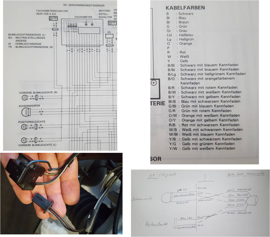 ich will mir einen neuen Scheinwerfer anbauen. Nachdem ich im Schaltplan nach den Farben gesucht habe, scheint das bei mir nicht ganz zu passen. Auf dem Bild habe ich Ausschnitte aus dem Schaltplan vom Werkstatthandbuch. Darin müssten die Kabel des Scheinwerfers neben schwarz/weiß noch gelb und weiß sein. Tatsächlich sind sie aber schwarz/weiß sowie schwarz/gelb und schwarz/blau (Stecker in meiner Hand). Die Positionsleuchte scheint zu stimmen.