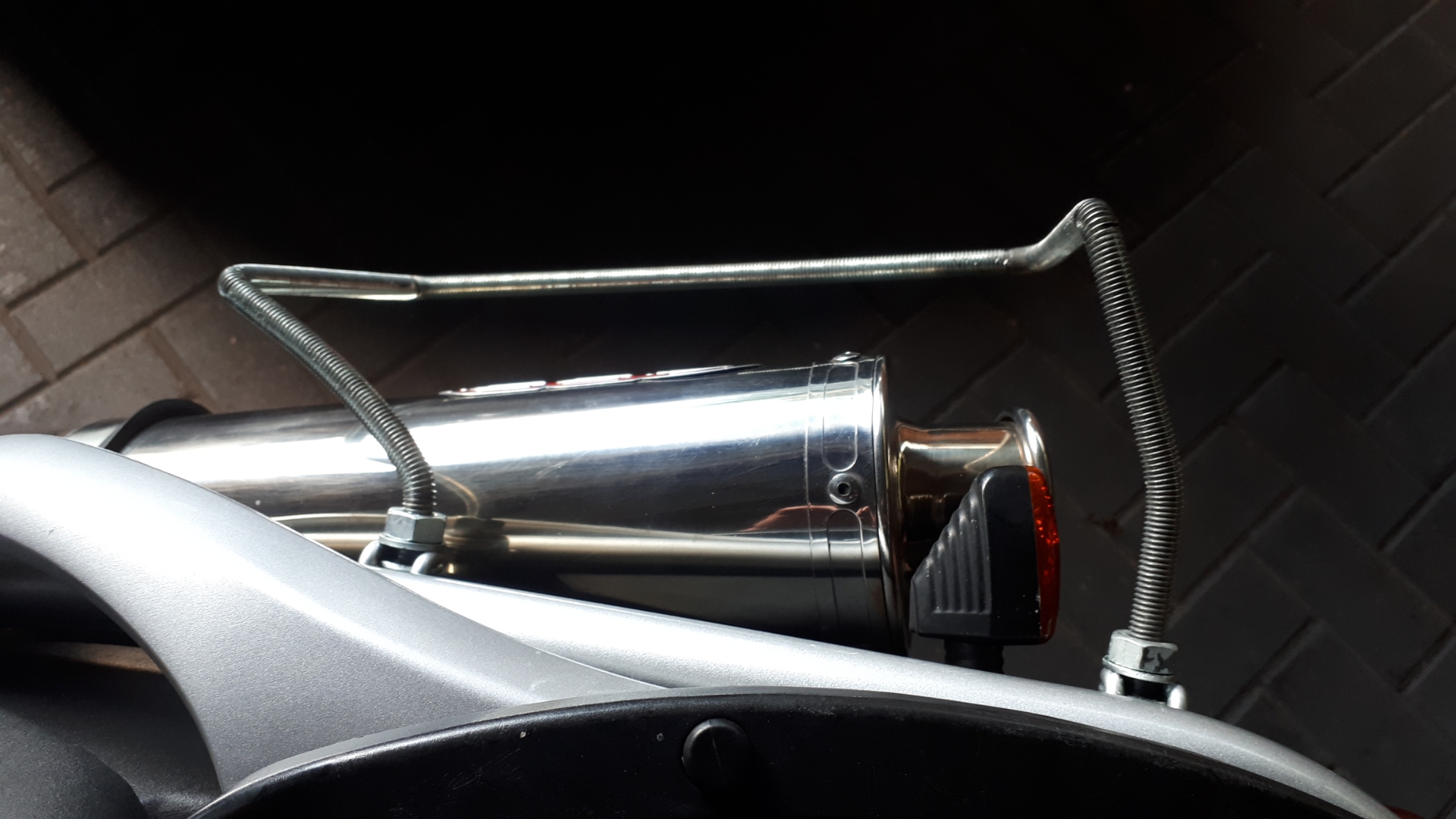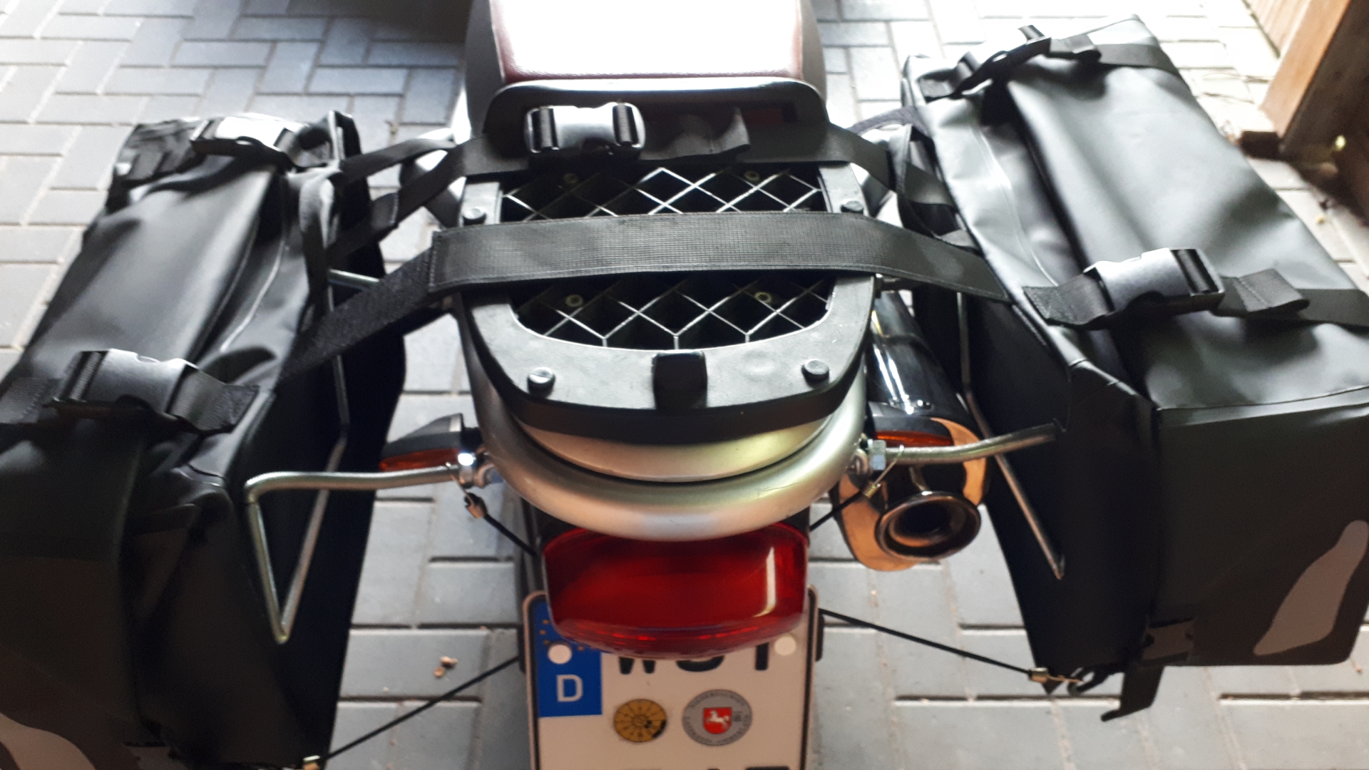 Jetzt hat Polo wie ich finde, sehr coole Softbags im Programm. ST 07 ist die Bezeichnung. Die sollten es sein. Und für das Auspuff-Problem habe ich aus einer 10mm Gewindestande einen Abstandshalter gebogen.